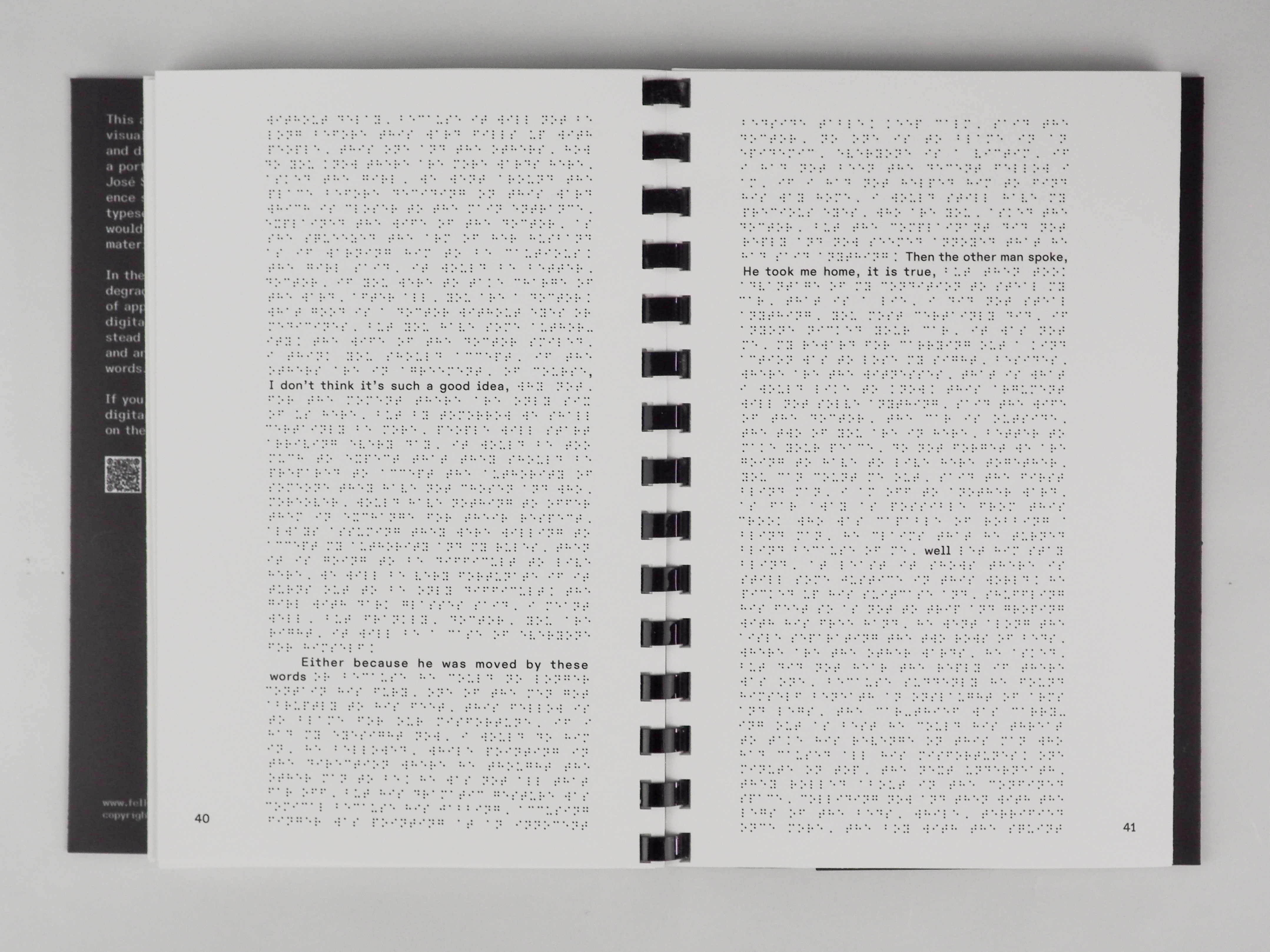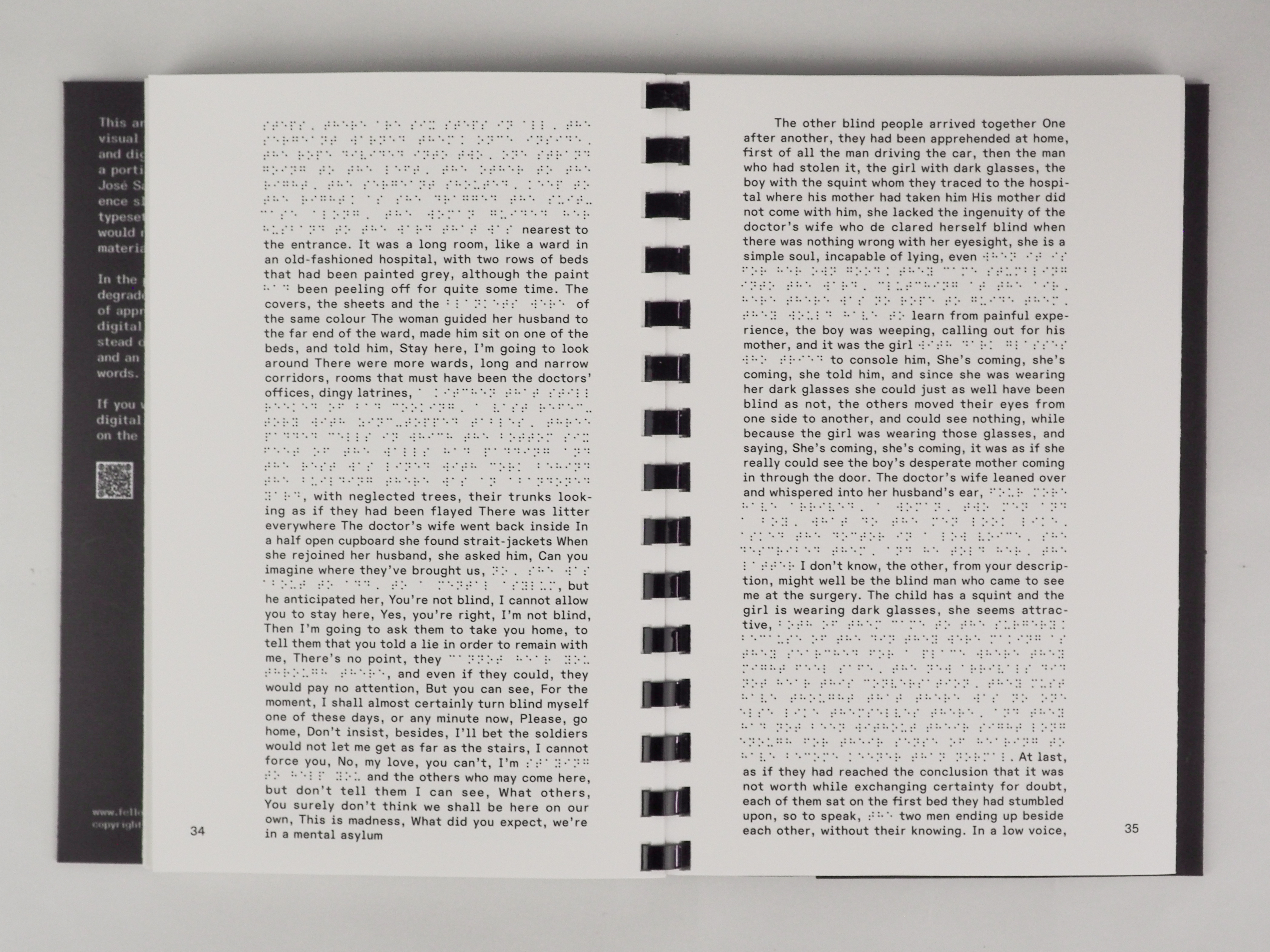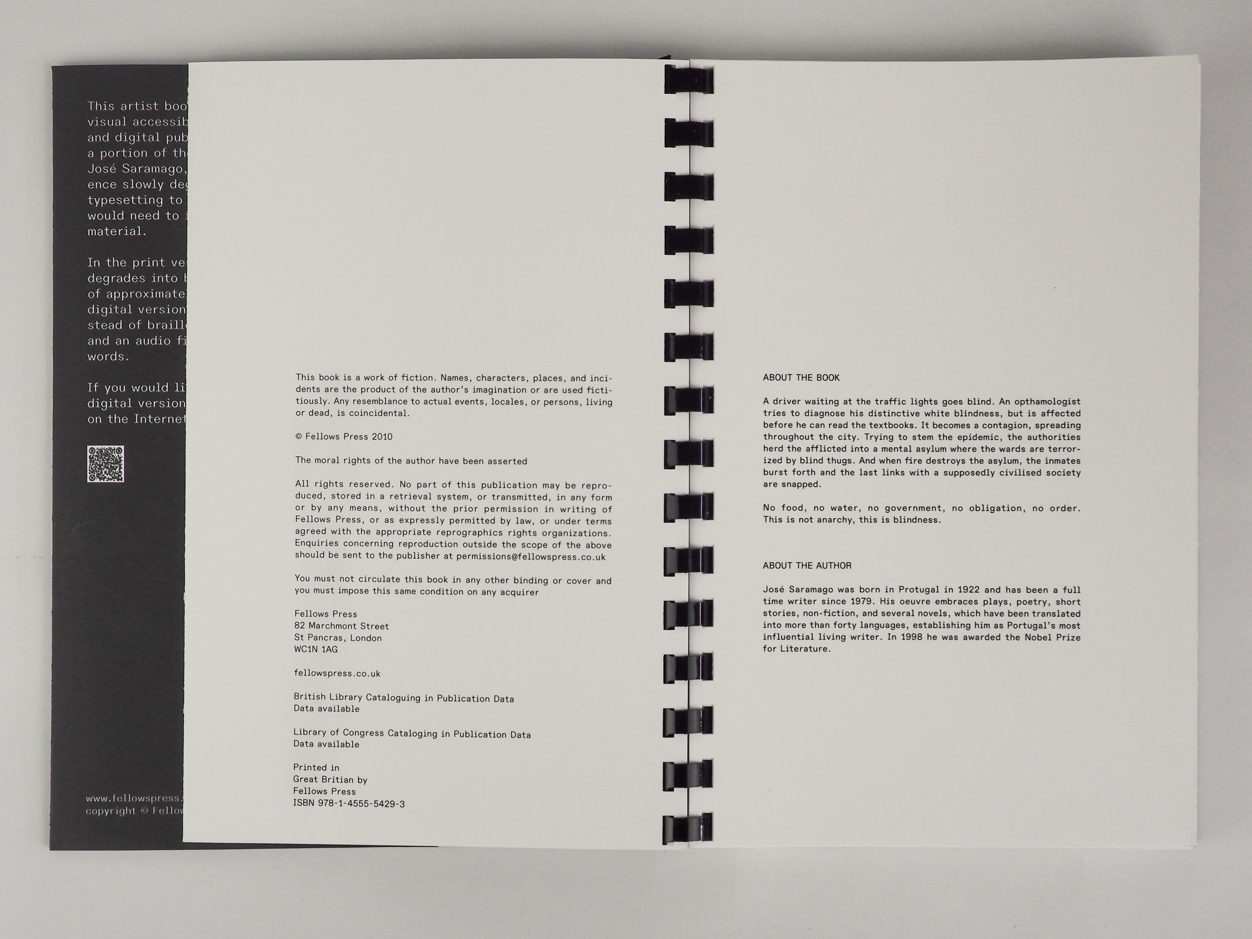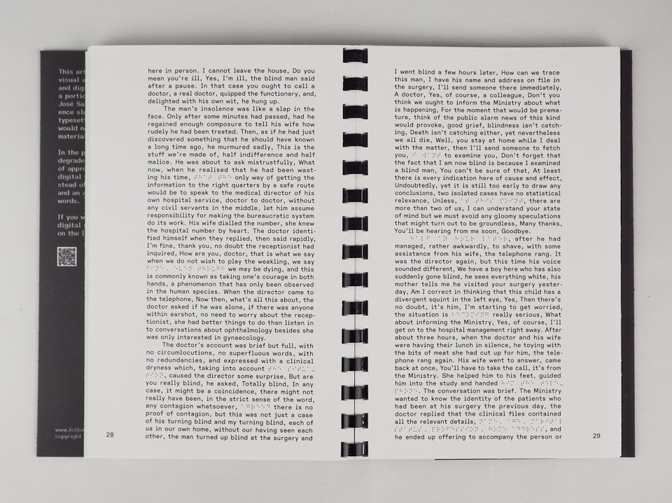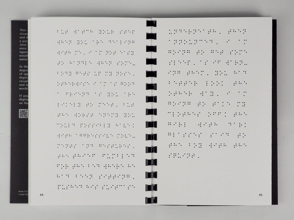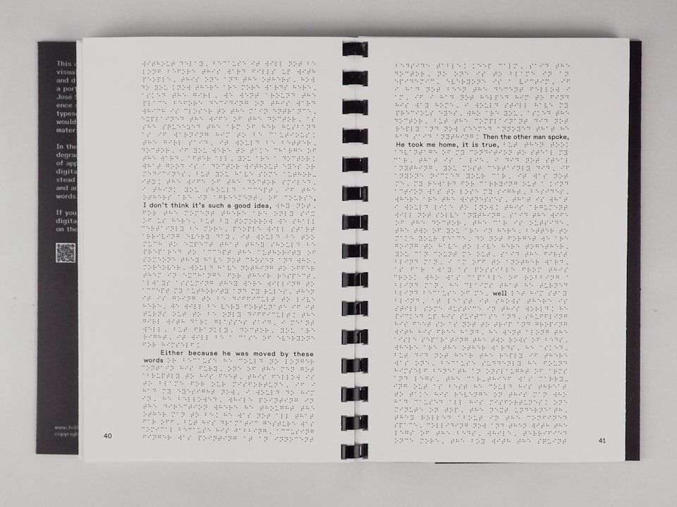 Blindness is a comment on accessibility for individuals with visual impairments. Working with a portion of the book by José Saramago of the same name, I created a reading experience that slowly degrades from a ‘normal’ typesetting to what a blind individual would need to interact with the material. In the print version, the text slowly degrades into braille over the course of approximately sixty pages. The digital version also degrades, but instead of braille the text is invisible and an audio file plays the missing words.