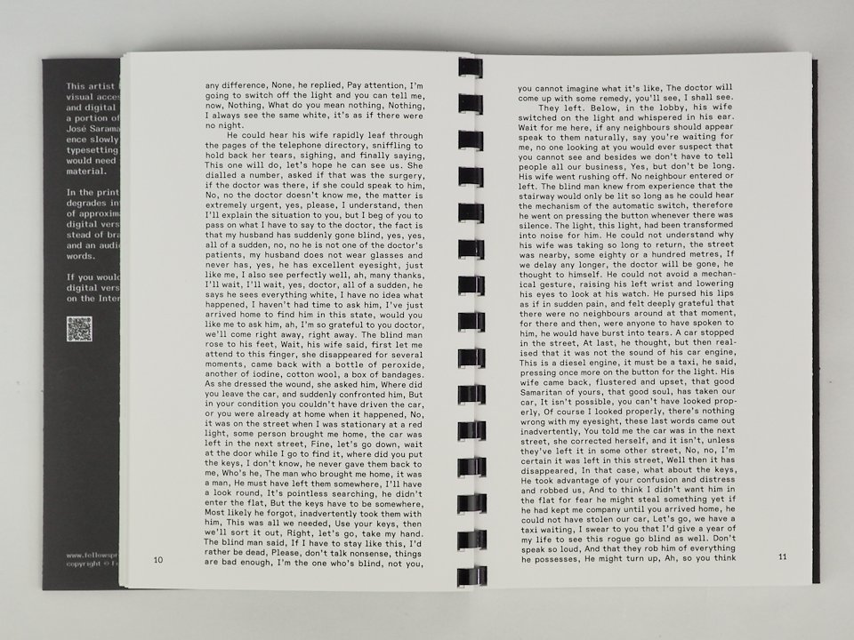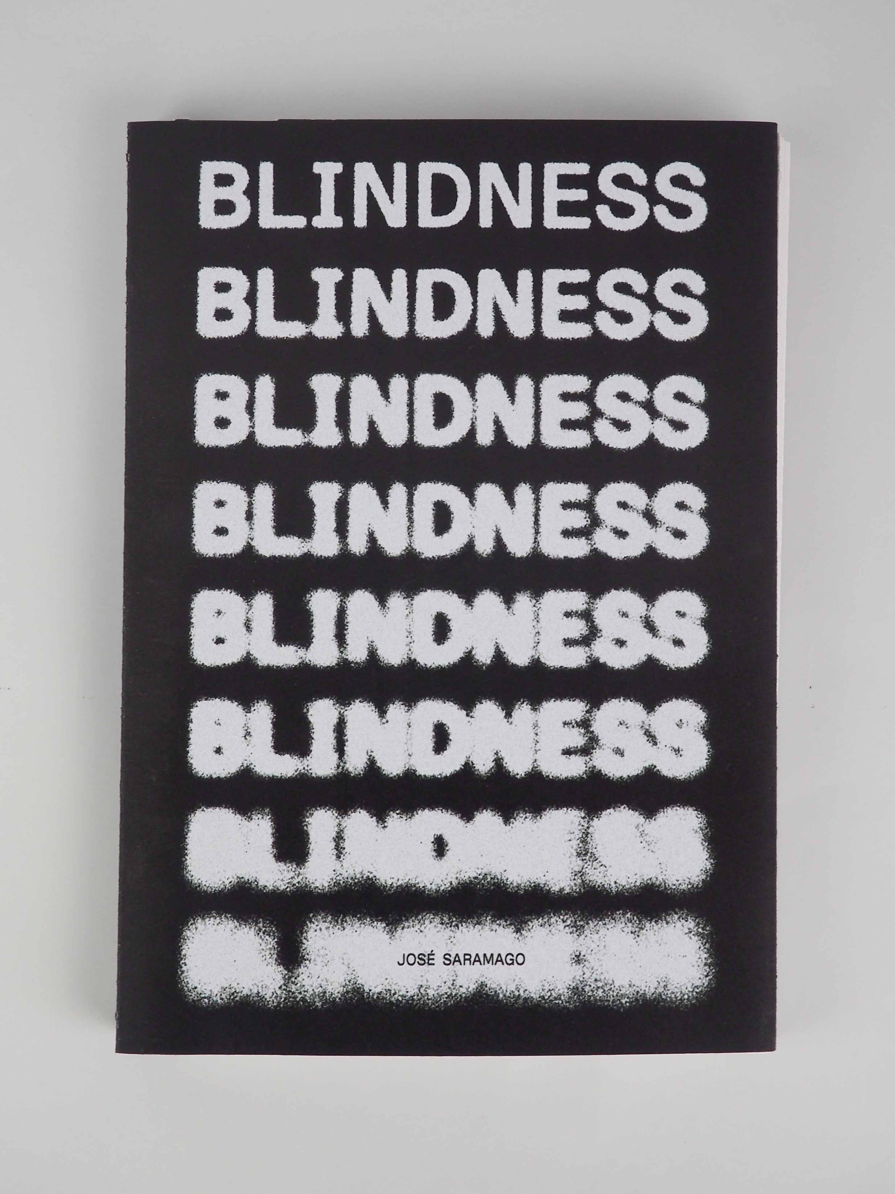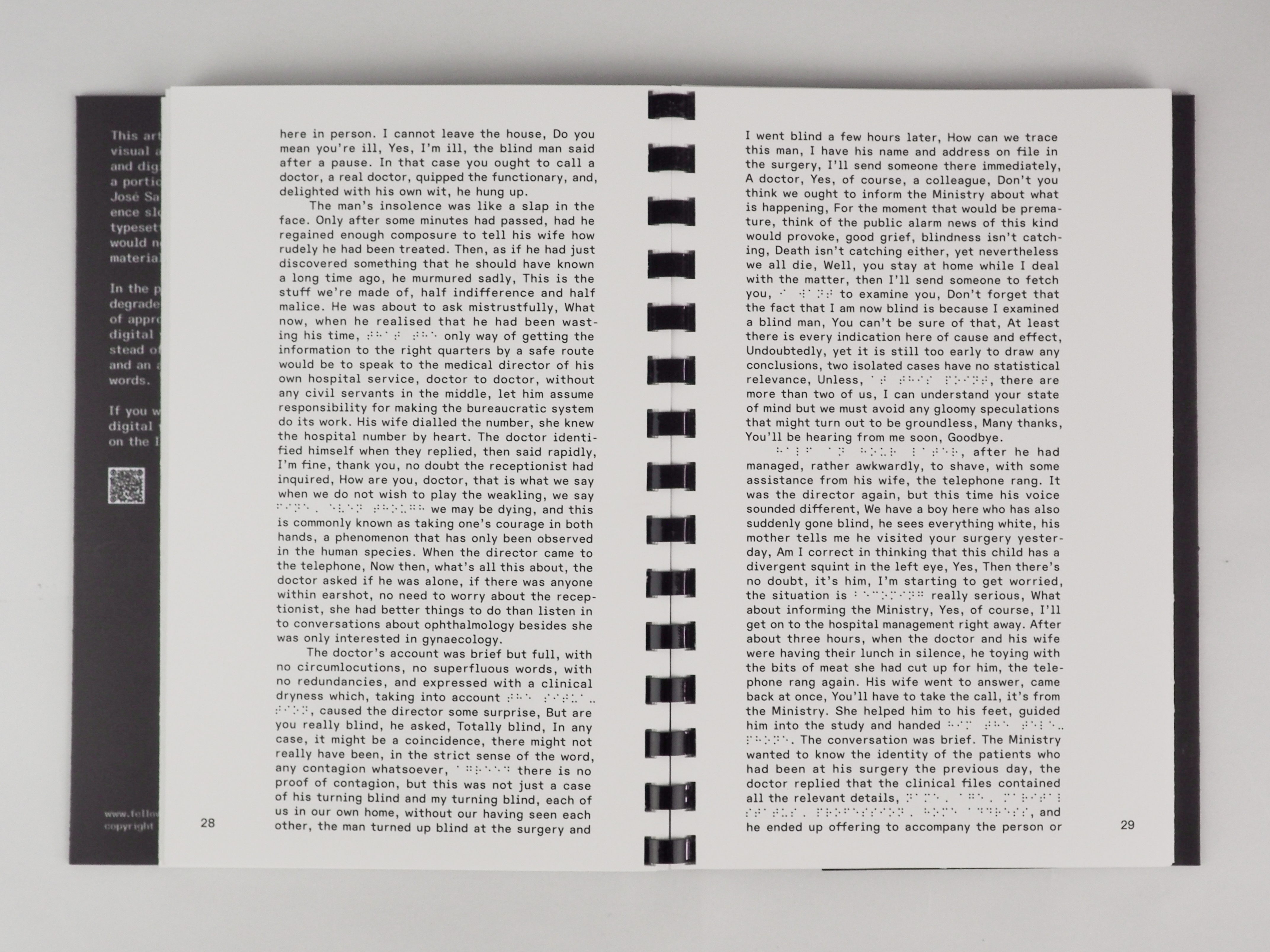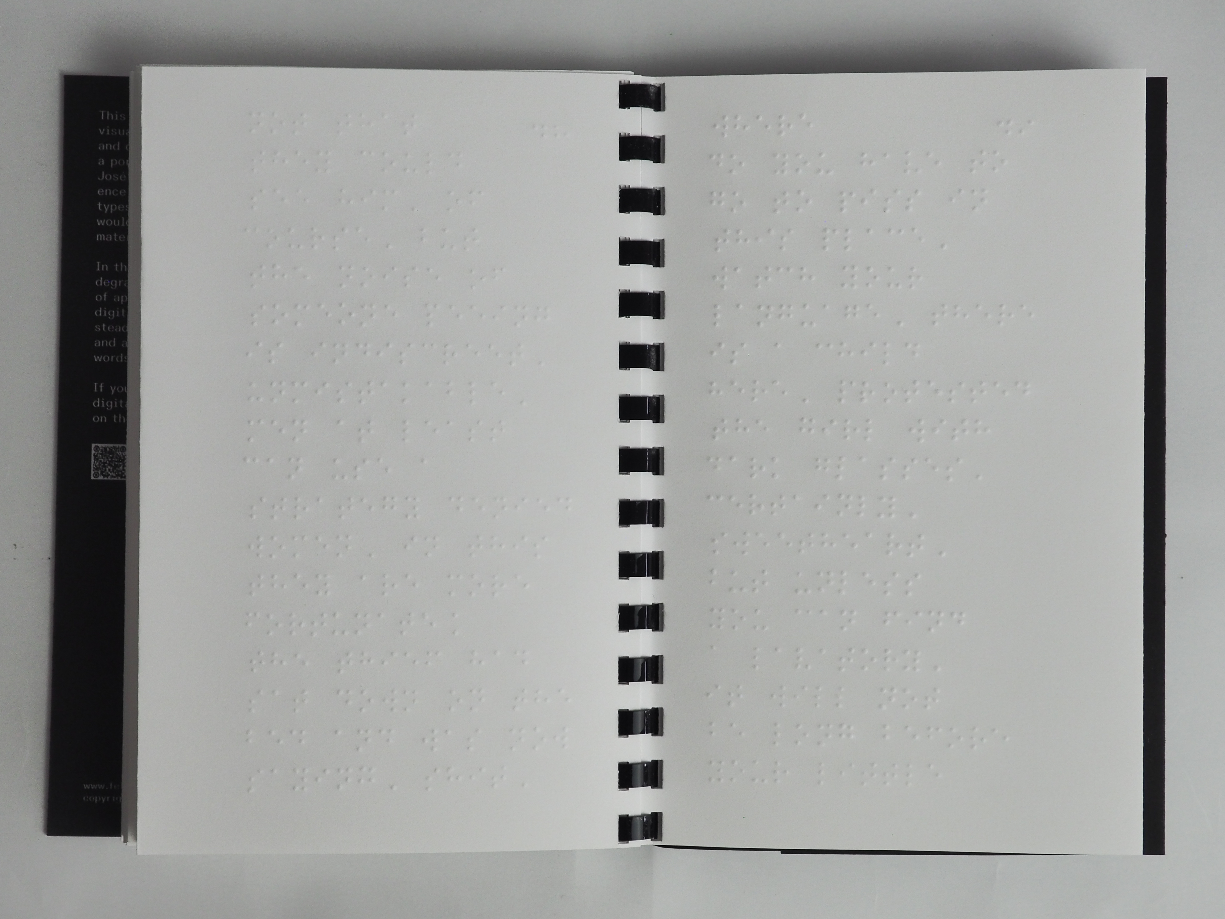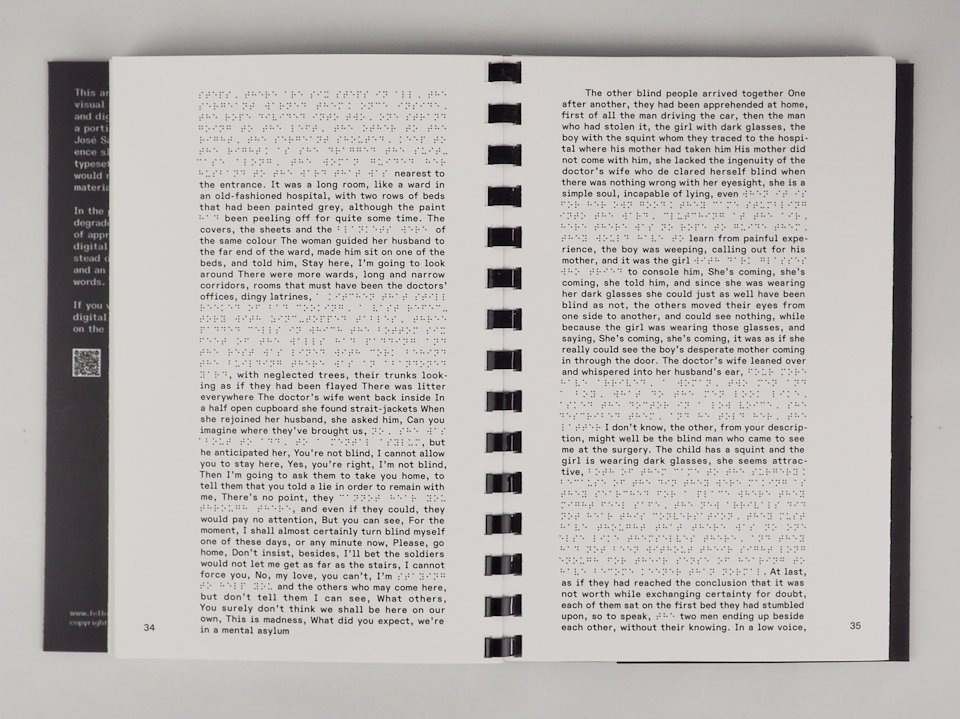 Blindness is a comment on accessibility for individuals with visual impairments. Working with a portion of the book by José Saramago of the same name, I created a reading experience that slowly degrades from a ‘normal’ typesetting to what a blind individual would need to interact with the material. In the print version, the text slowly degrades into braille over the course of approximately sixty pages. The digital version also degrades, but instead of braille the text is invisible and an audio file plays the missing words.