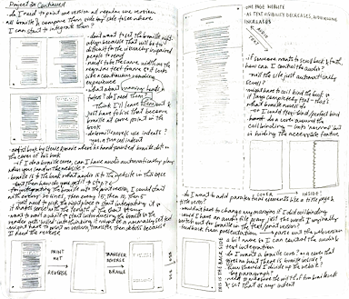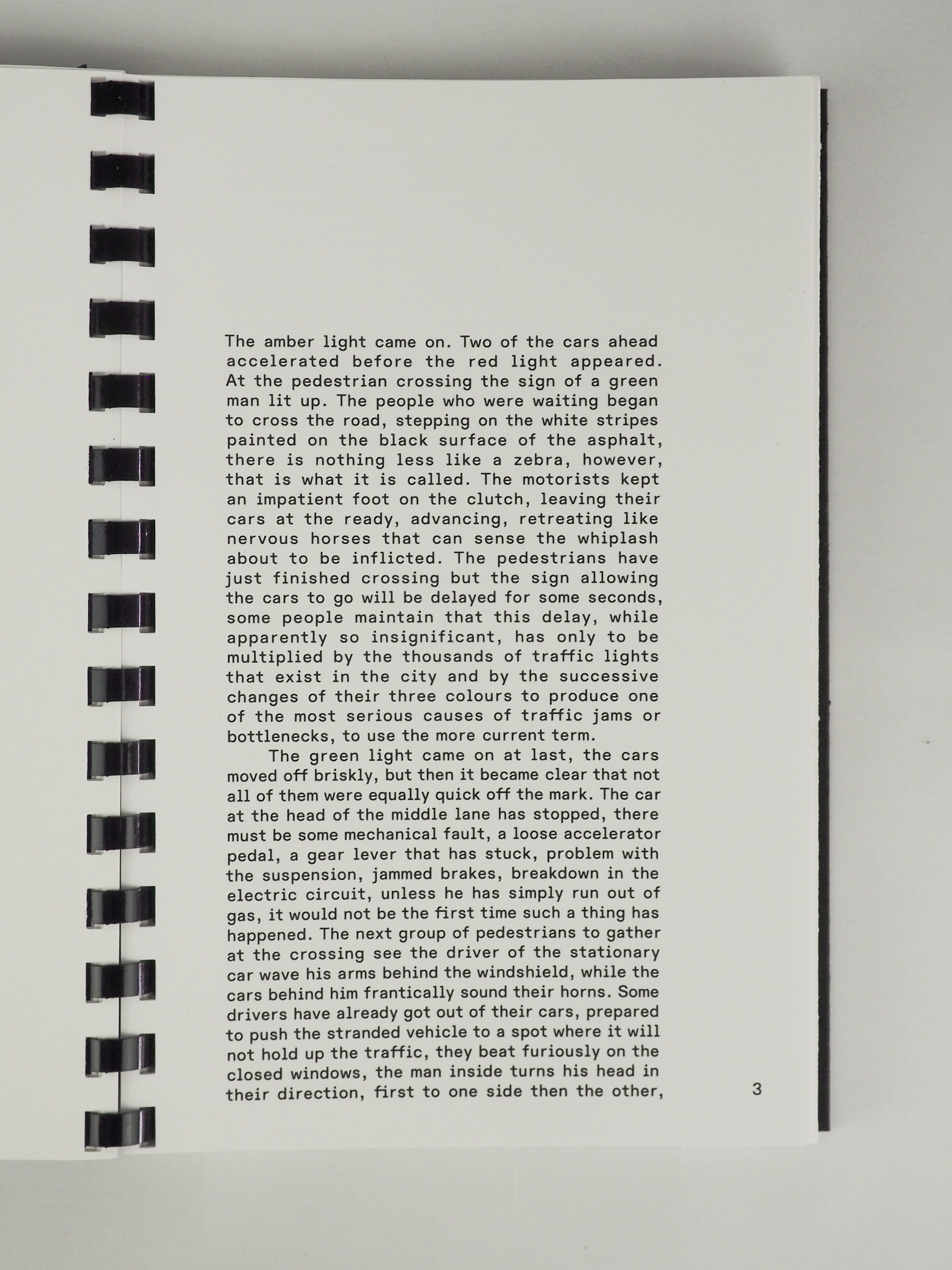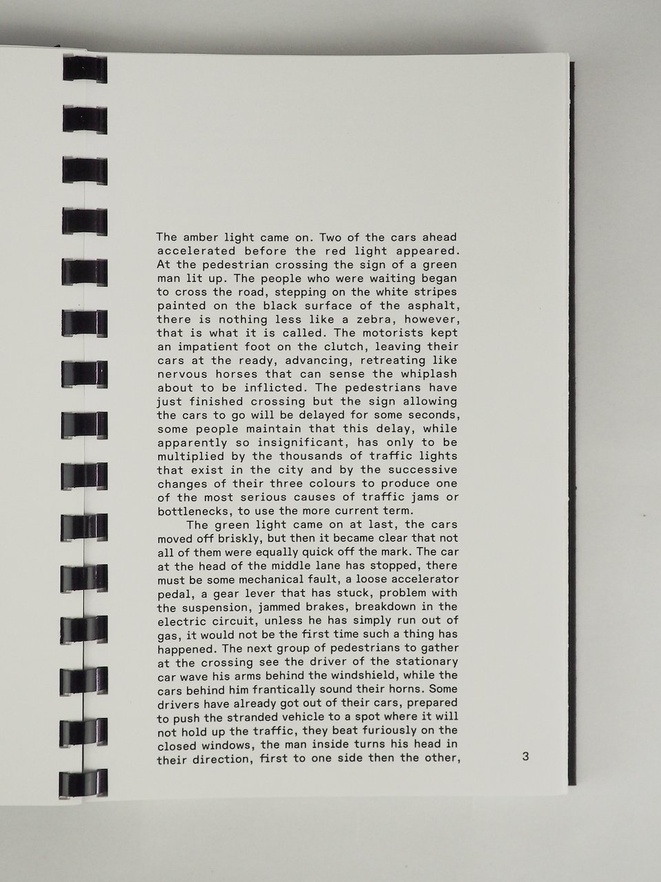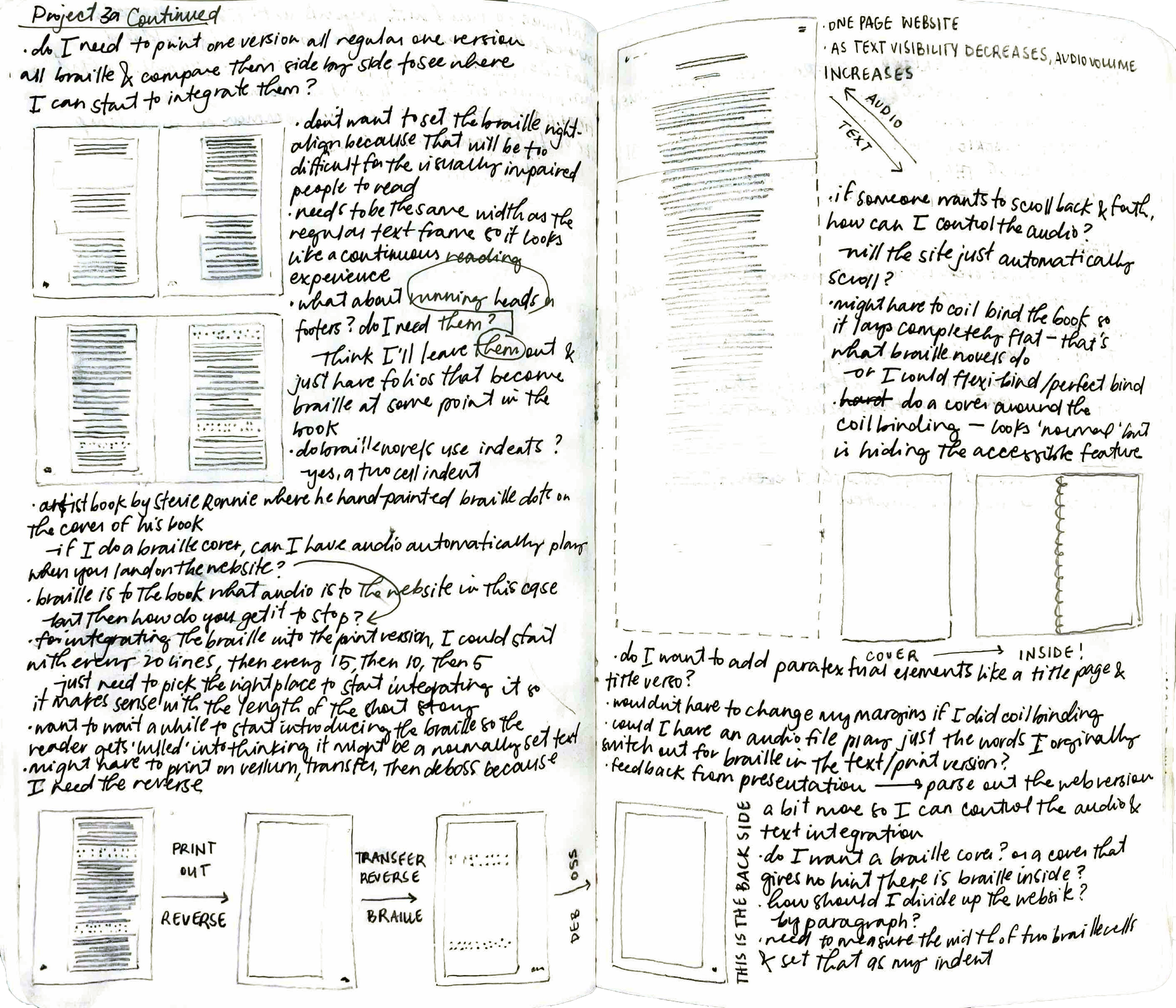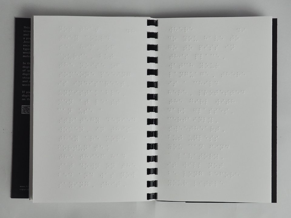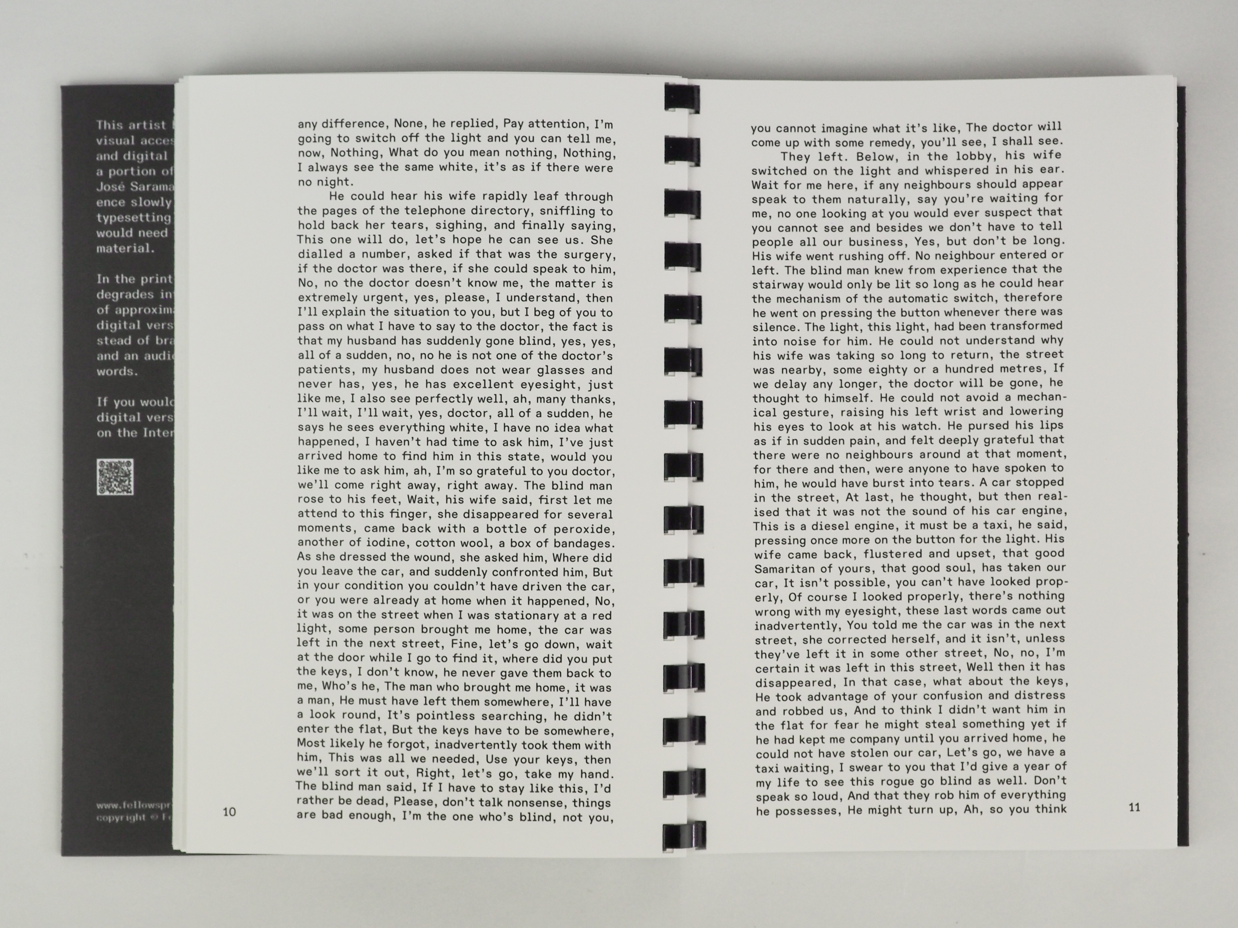 Blindness is a comment on accessibility for individuals with visual impairments. Working with a portion of the book by José Saramago of the same name, I created a reading experience that slowly degrades from a ‘normal’ typesetting to what a blind individual would need to interact with the material. In the print version, the text slowly degrades into braille over the course of approximately sixty pages. The digital version also degrades, but instead of braille the text is invisible and an audio file plays the missing words.