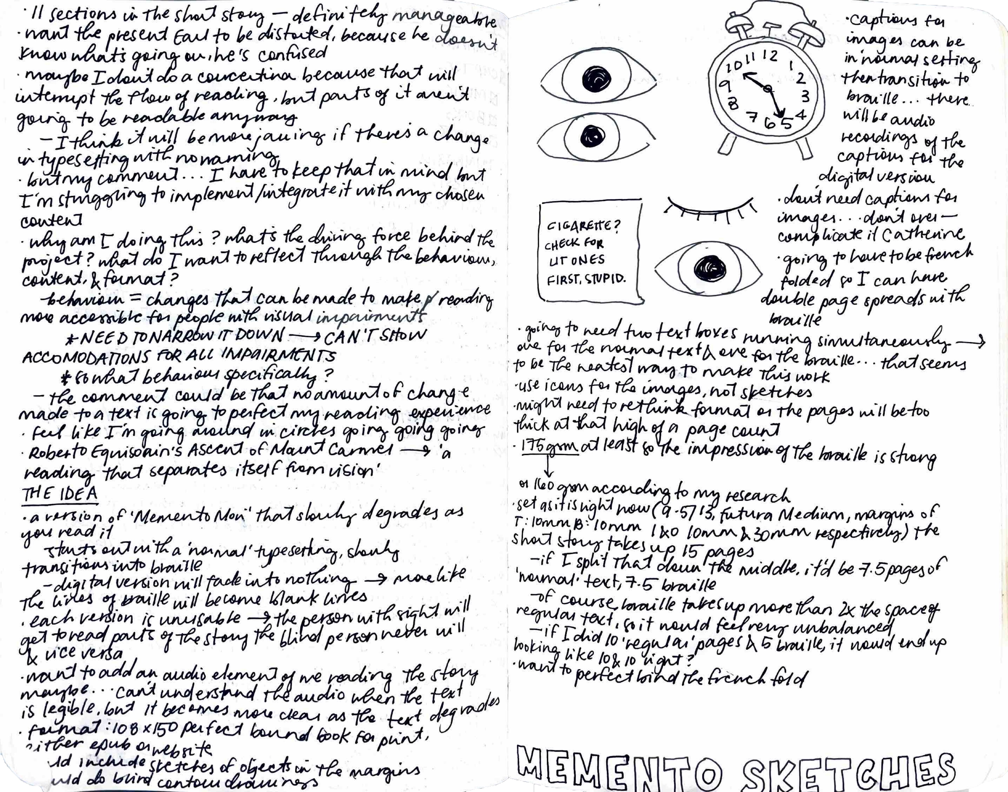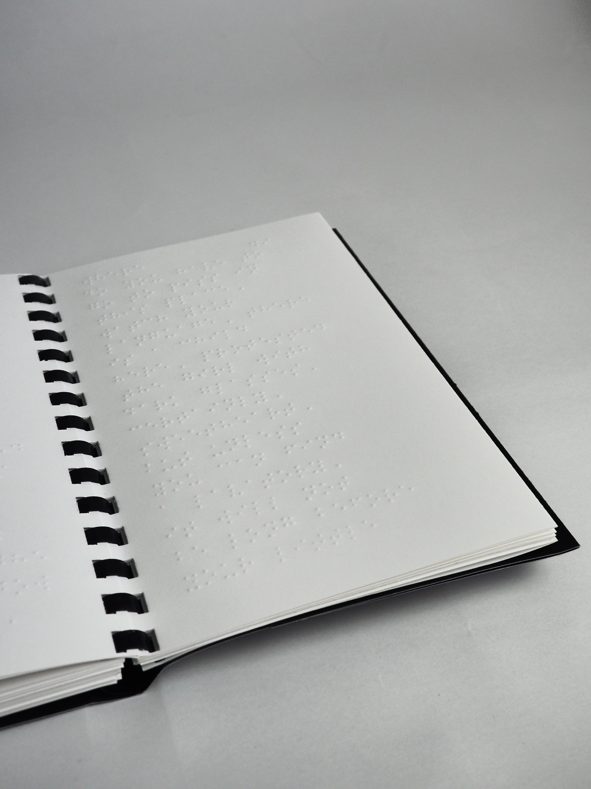 As soon as I decided to include braille in my project, I jumped into research regarding how to typeset it correctly. I spent a lot of time reading articles and manuals on how to correctly set braille in a book, and conducted research to find the right paper and binding method for braille novels. The resulting product uses 148 gsm paper (which is in the range of weights braille novels employ) and is coil bound. Once the entirety of the text was correctly set braille, I hand-debossed the dots to emulate the look and function of an actual braille novel.