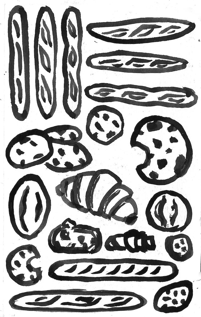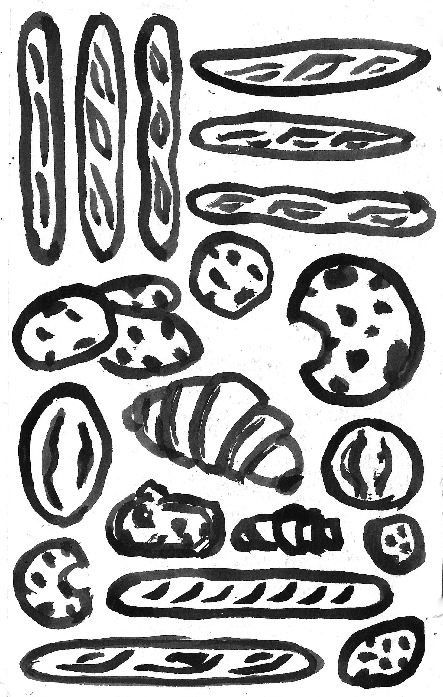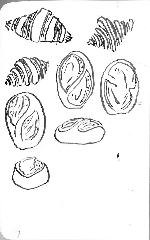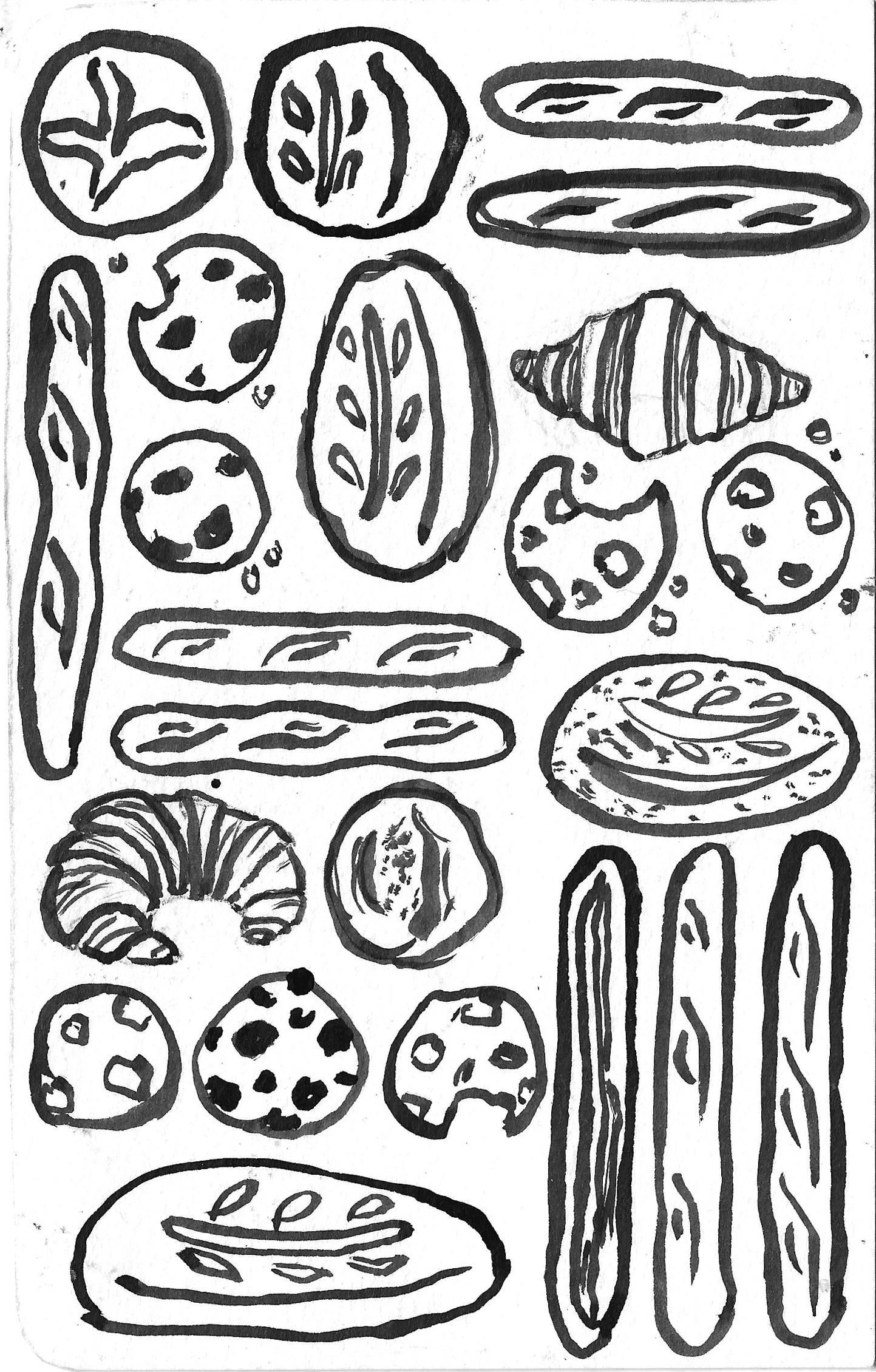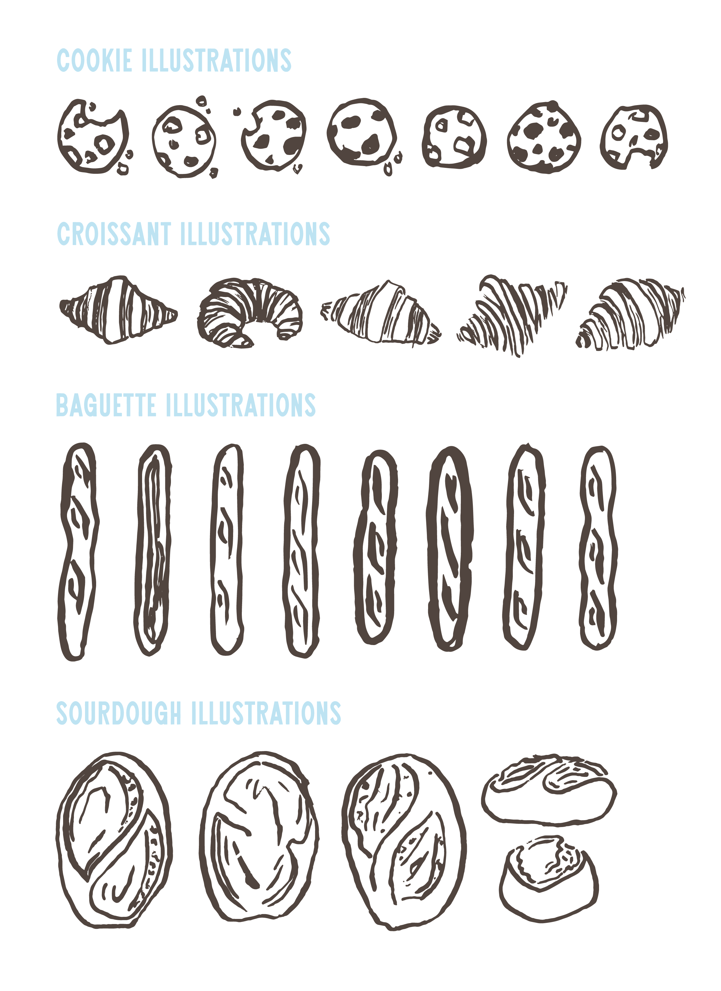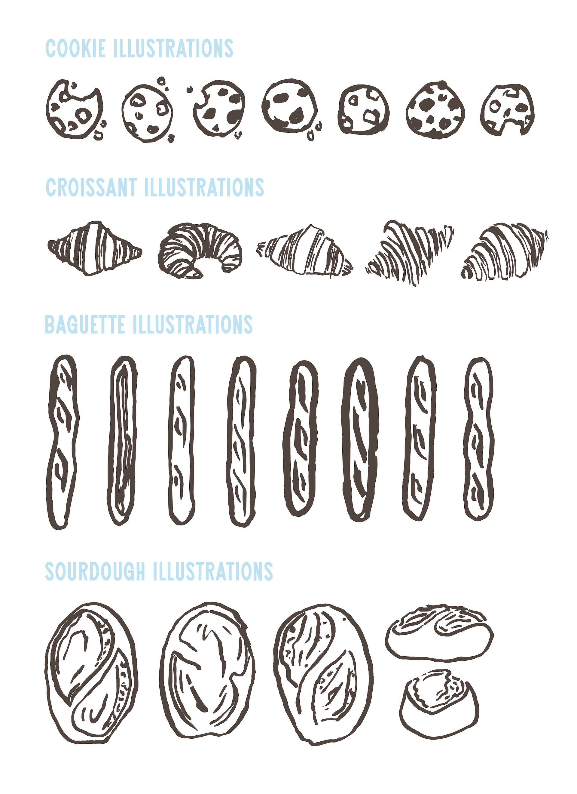 With the same tools, I illustrated their core baked goods in varying thicknesses & amounts of detail. The final versions were selected from these sketches and digitally refined. These illustrations work with the logo to craft the welcoming, friendly tone the Stinsons most wanted to portray.