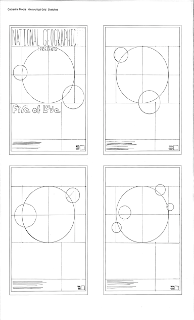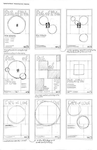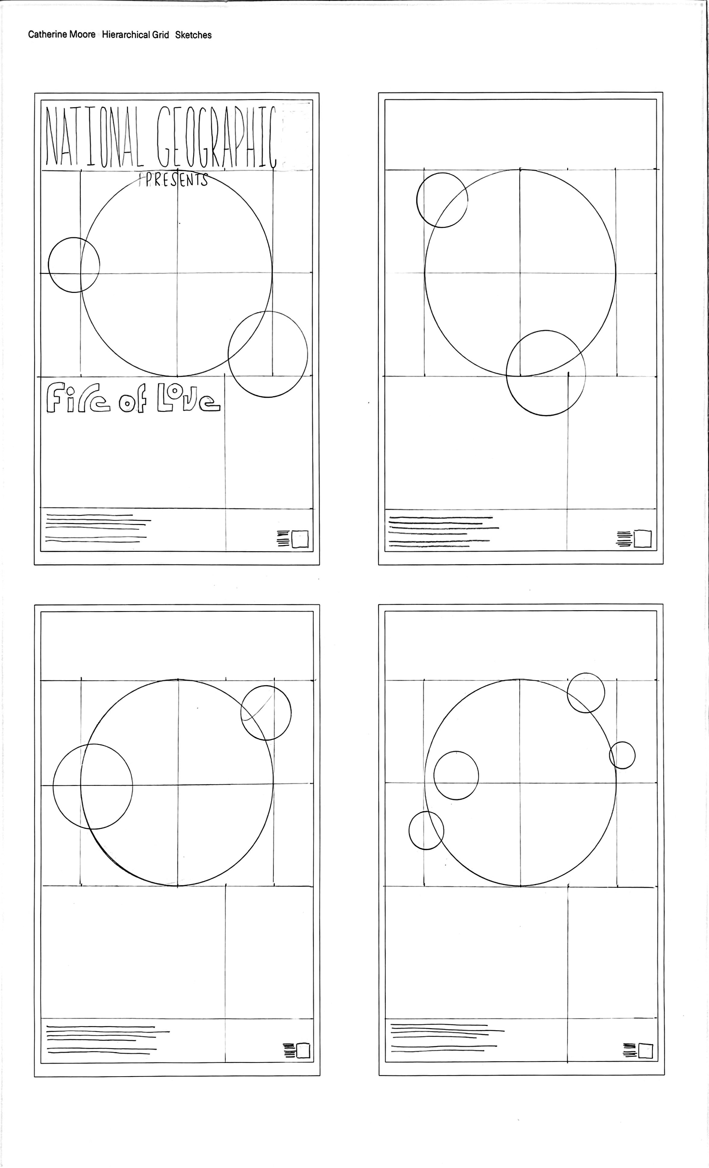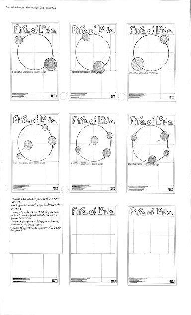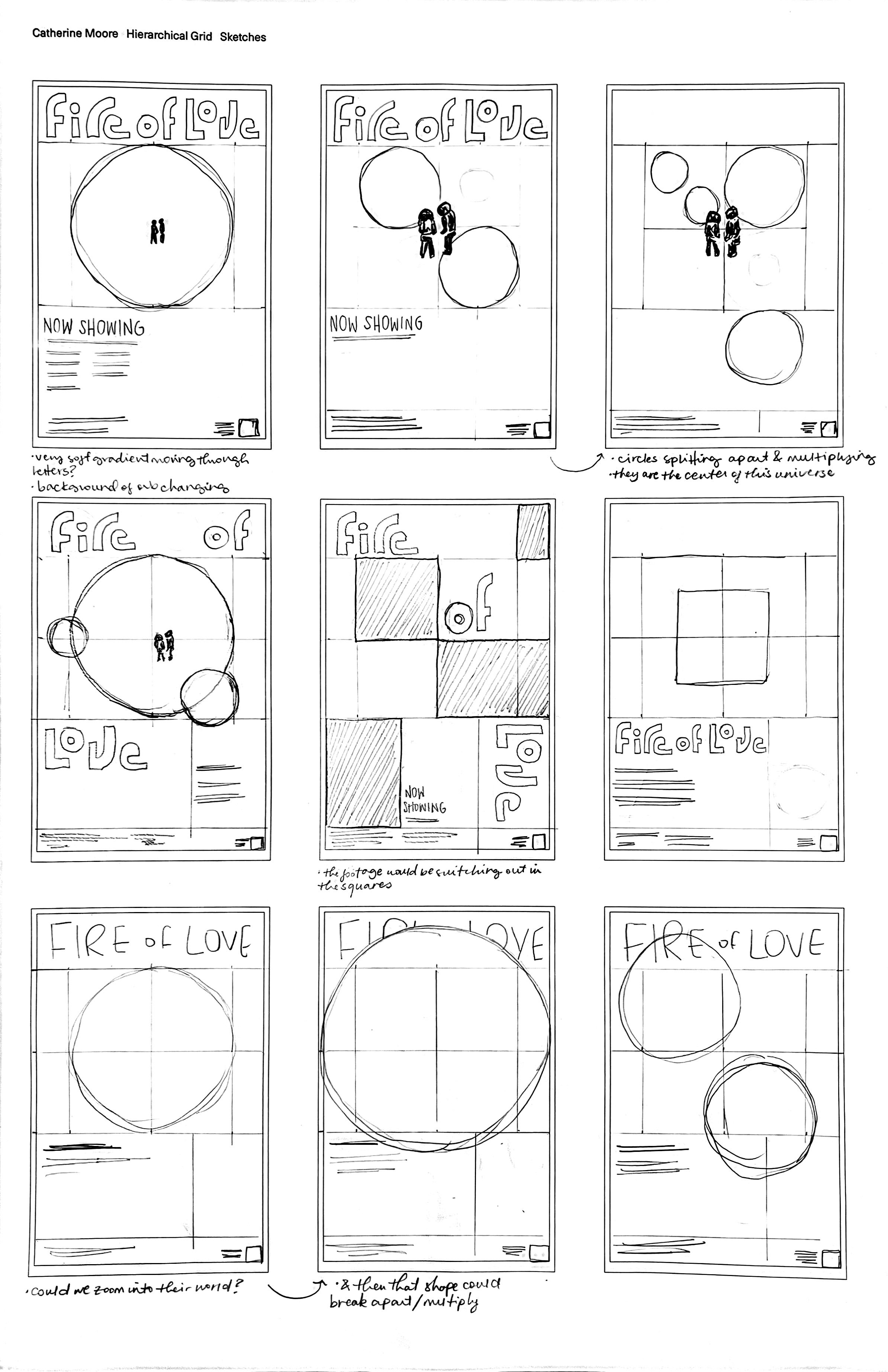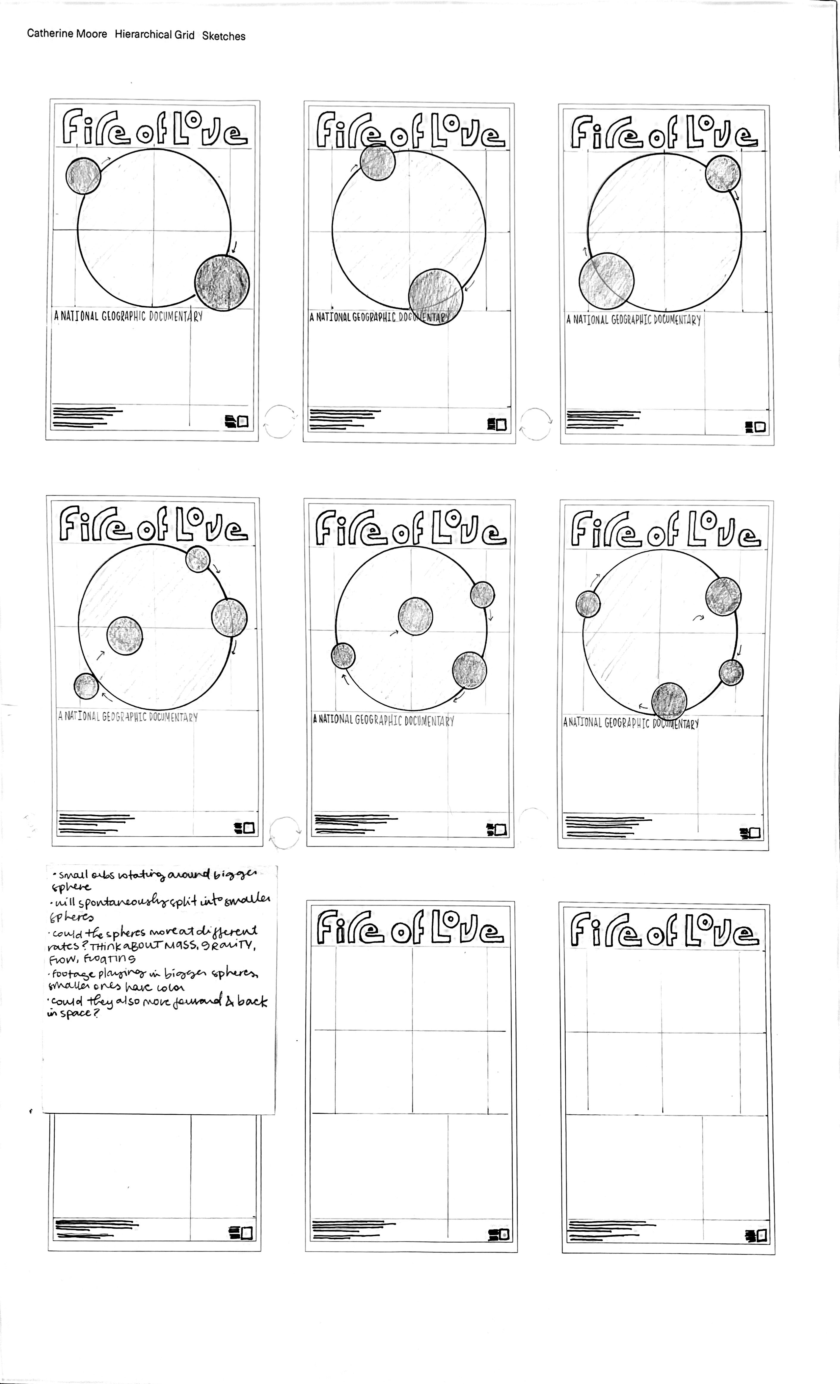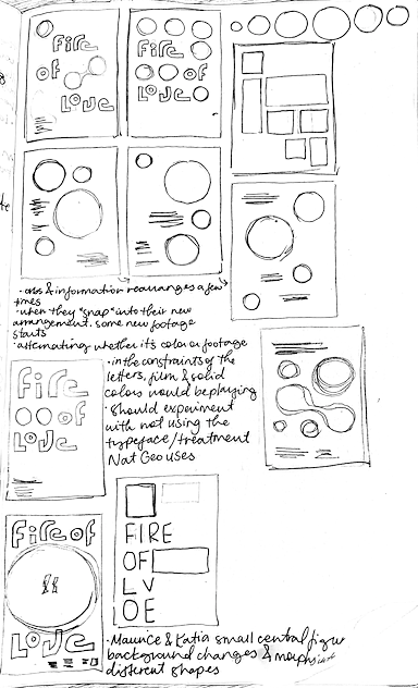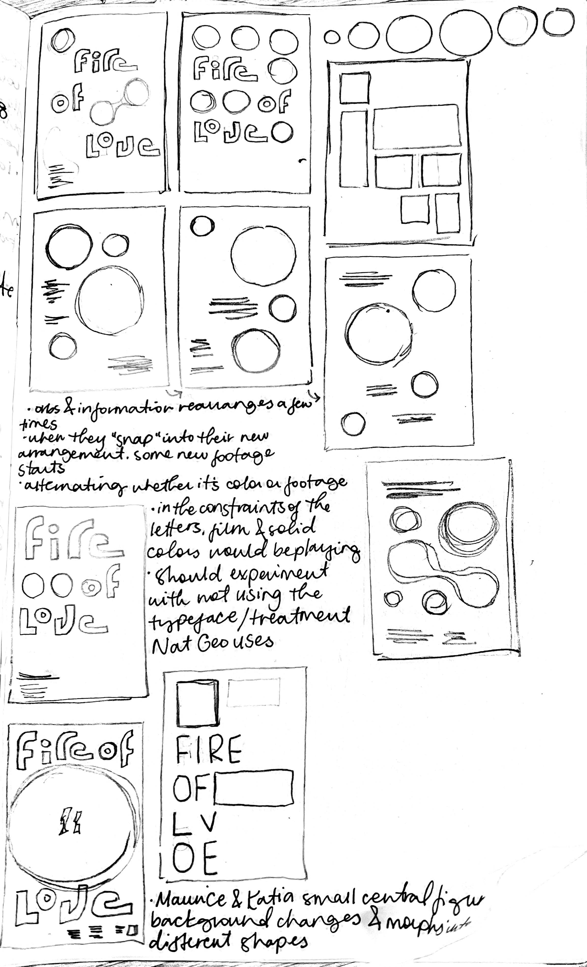 The documentary is a compilation of Maurice and Katia’s stunning research footage, so I decided to make that footage the focal point of my poster. To add another type of movement, I overlaid circles that orbit around the footage and split into two in time with explosions in the video. The colour and type choices all work to establish a visual tone that connects to the footage and the Kraffts’ line of work.