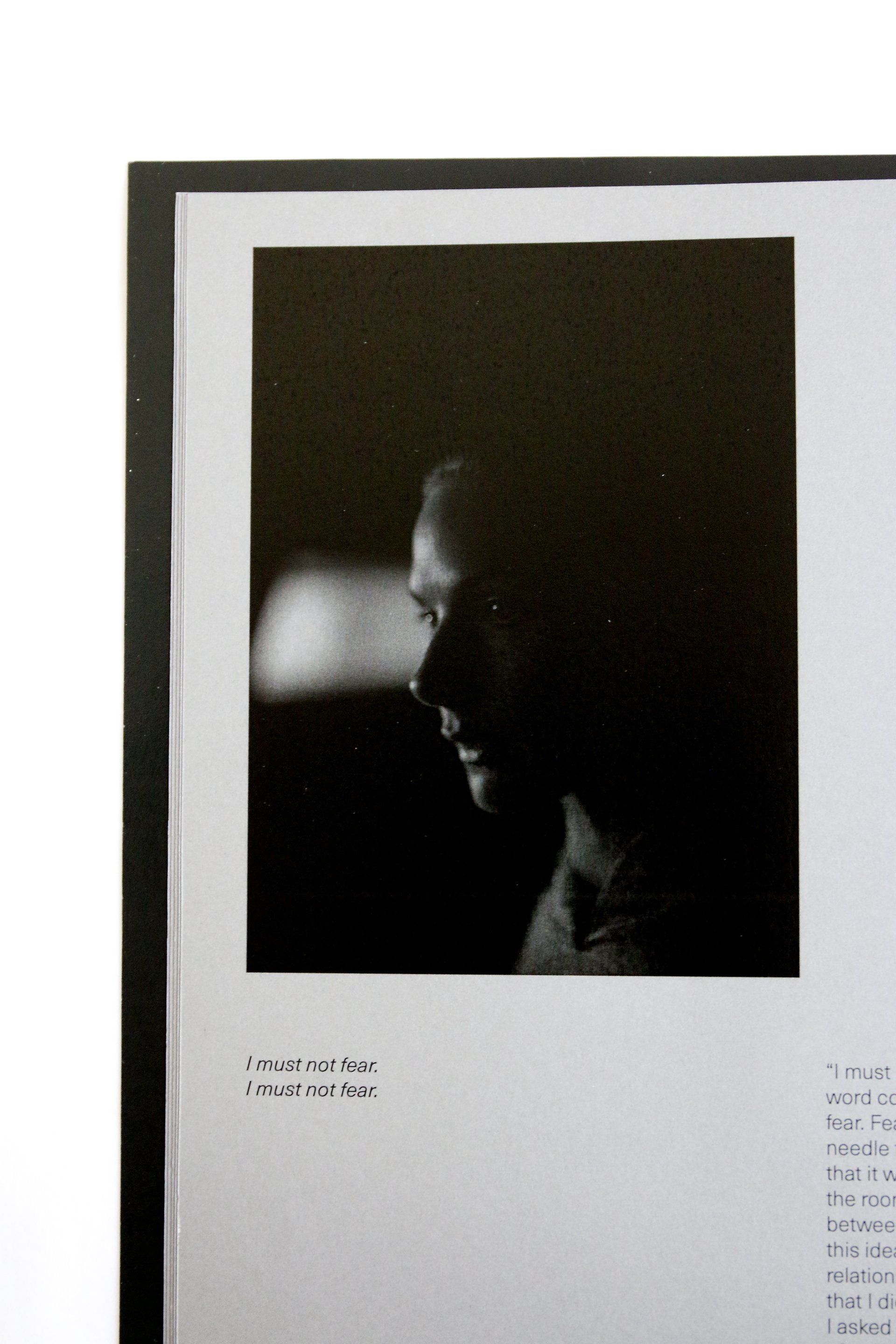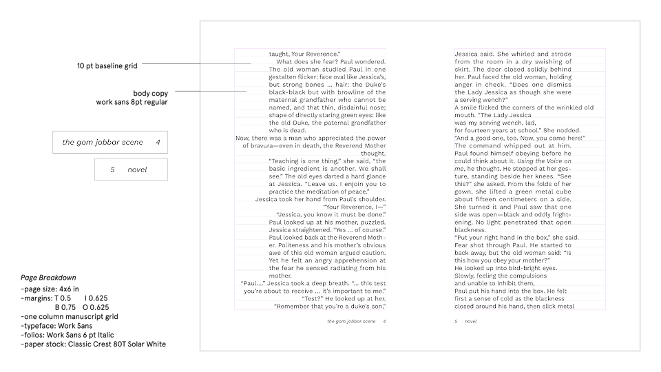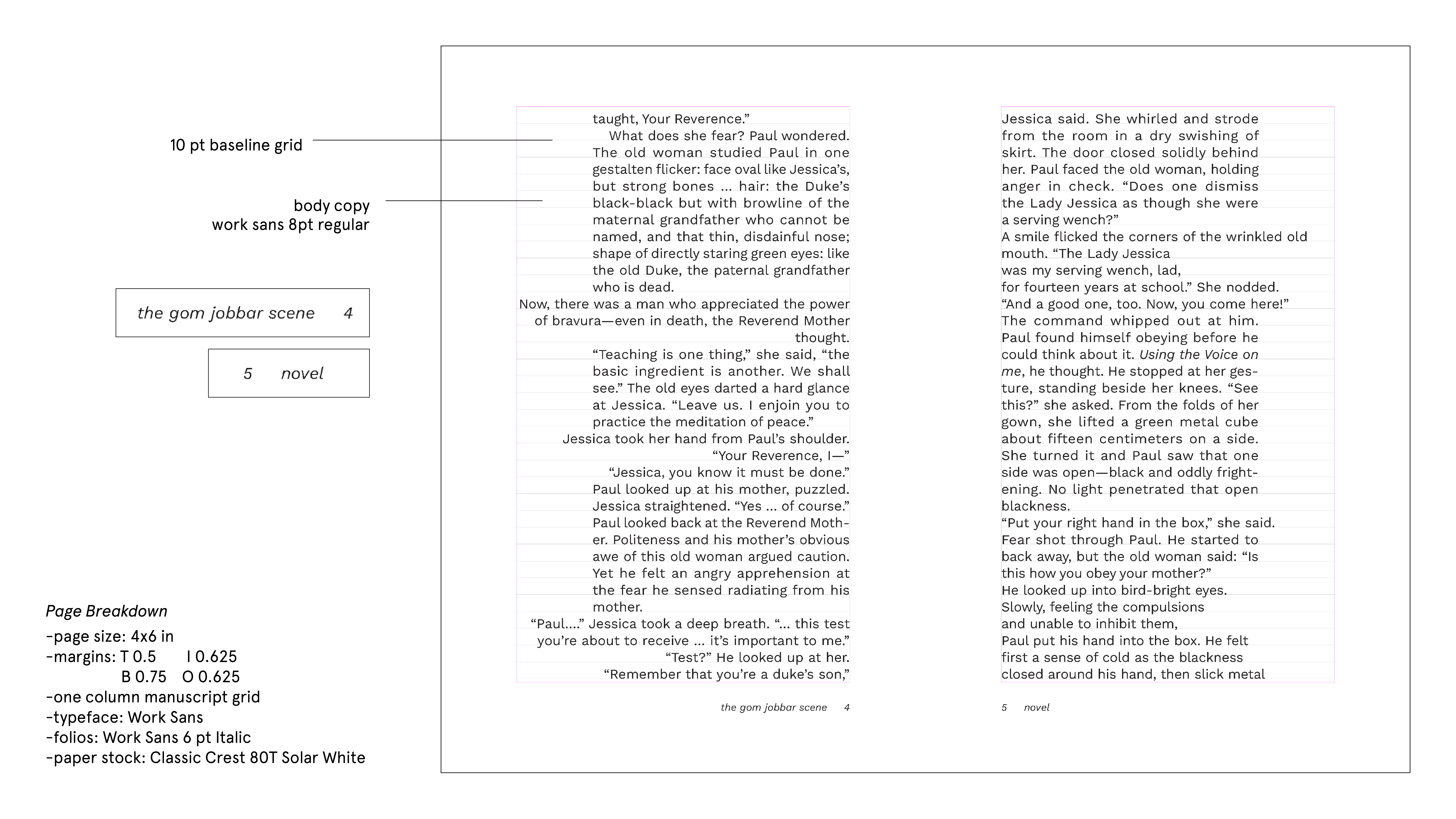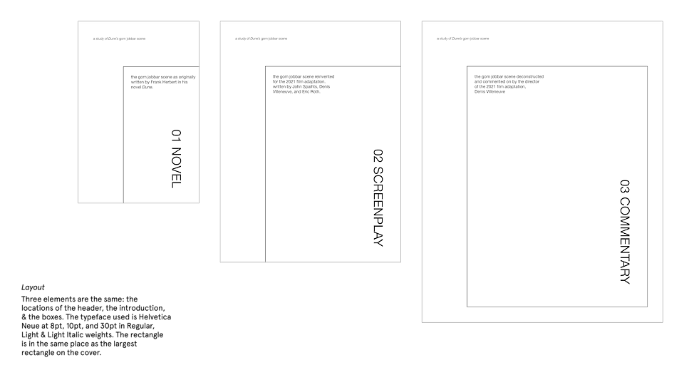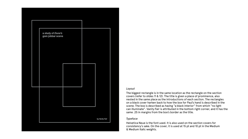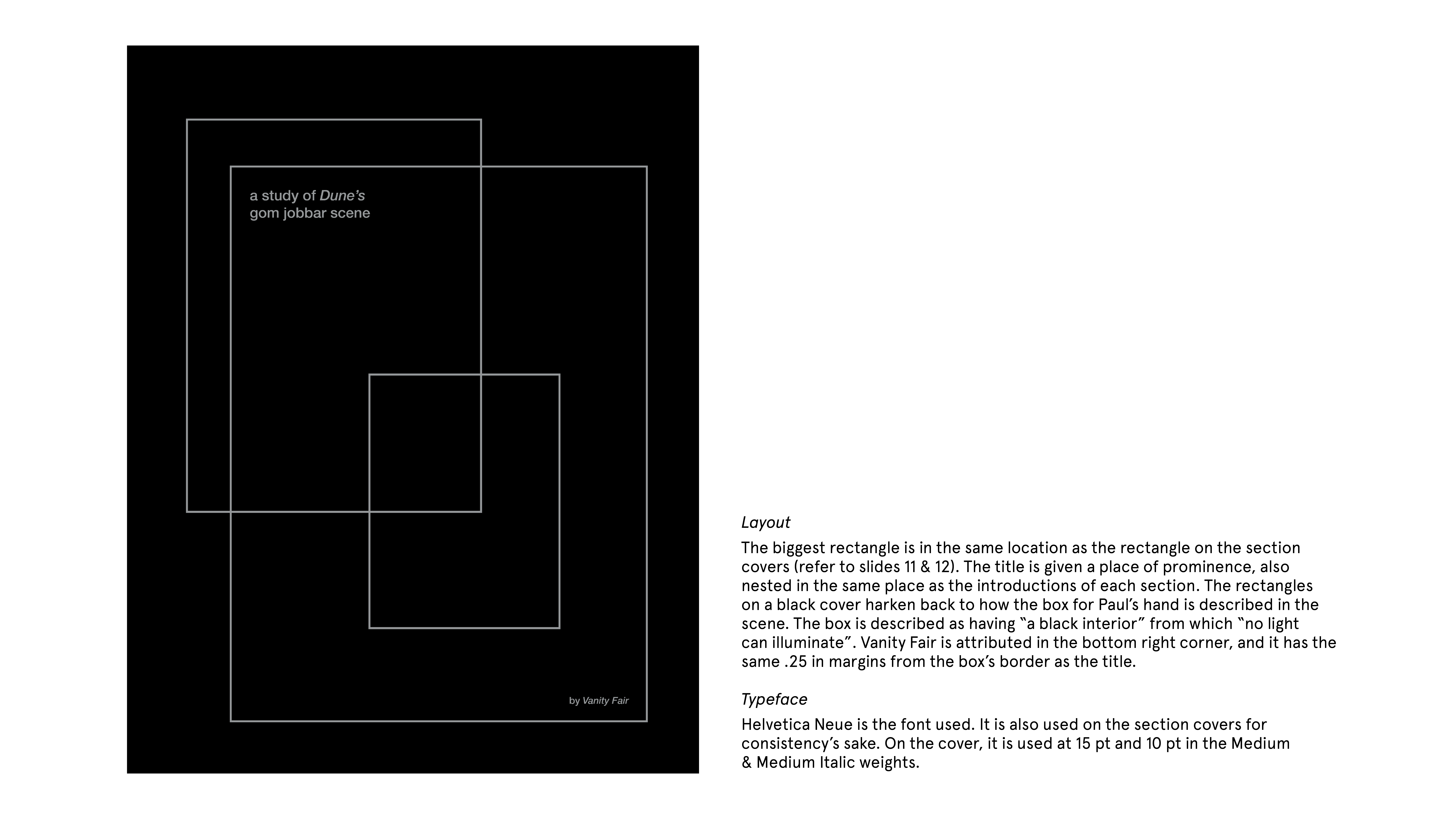 The gom jobbar scene involves the protagonist undergoing a test of putting his hand in a box to withstand massive amounts of pain. If he removes his hand from the box, a poisoned needle at his neck, called the gom jobbar, will end his life. As a way of incorporating the events of the scene into the piece, I used a rectangular motif throughout. I also aimed to communicate the futuristic, scientific tone of the book in how I treated the typography and layouts.