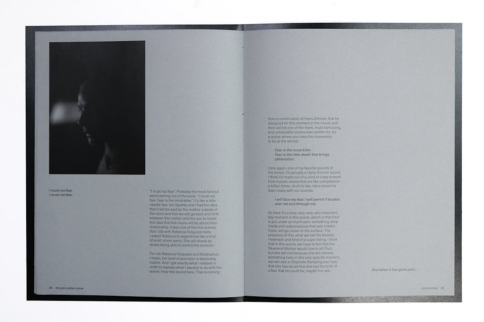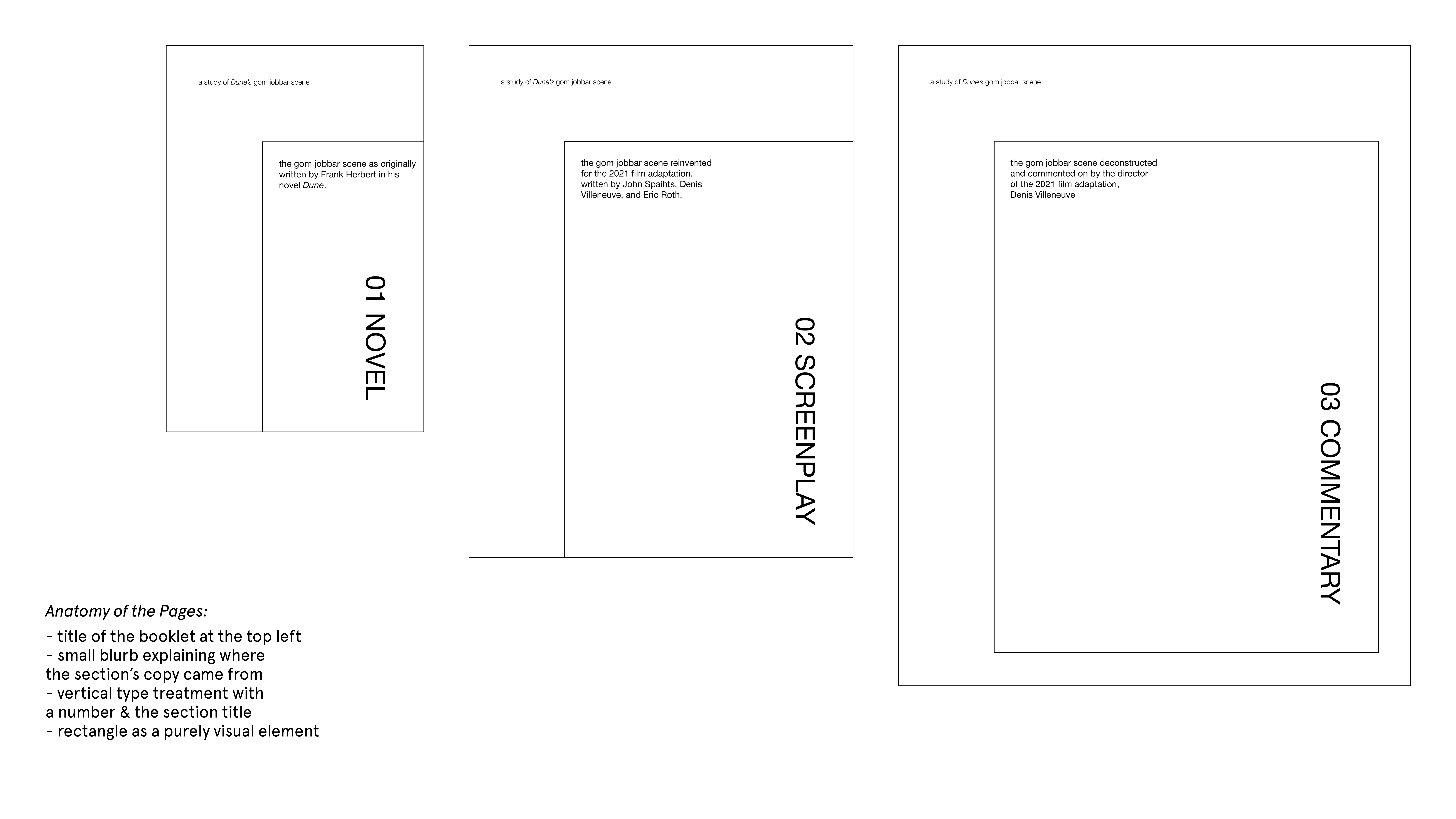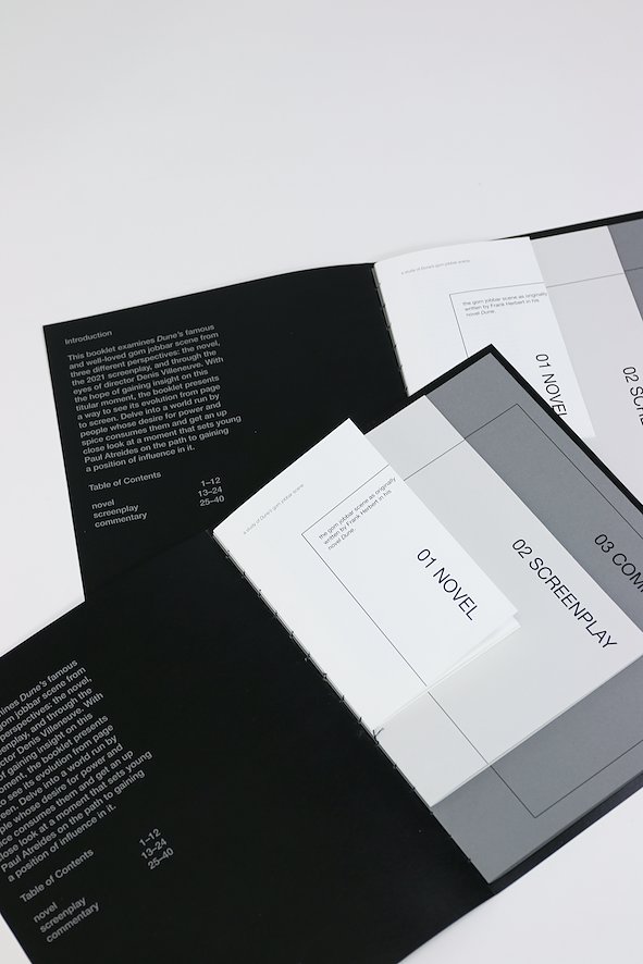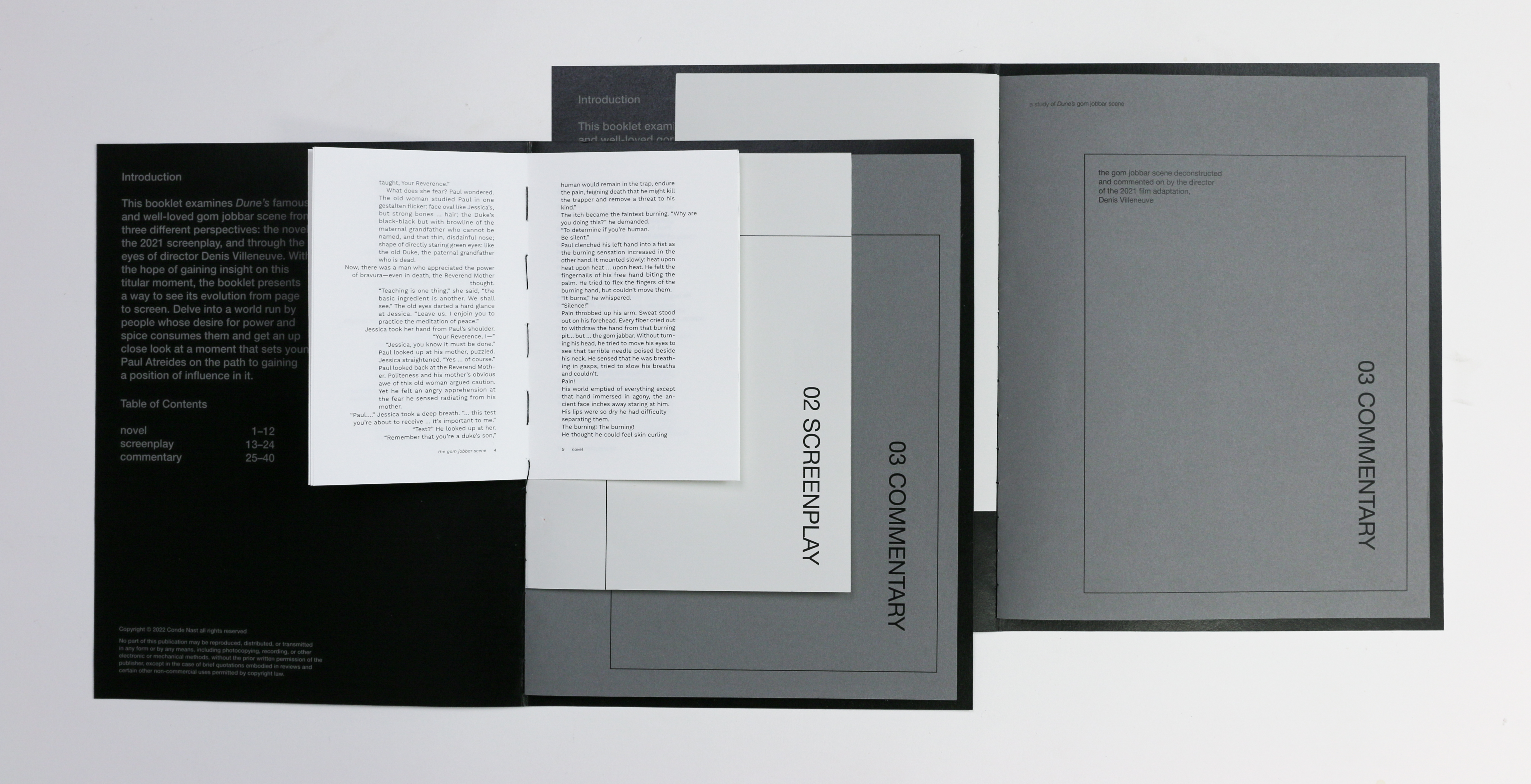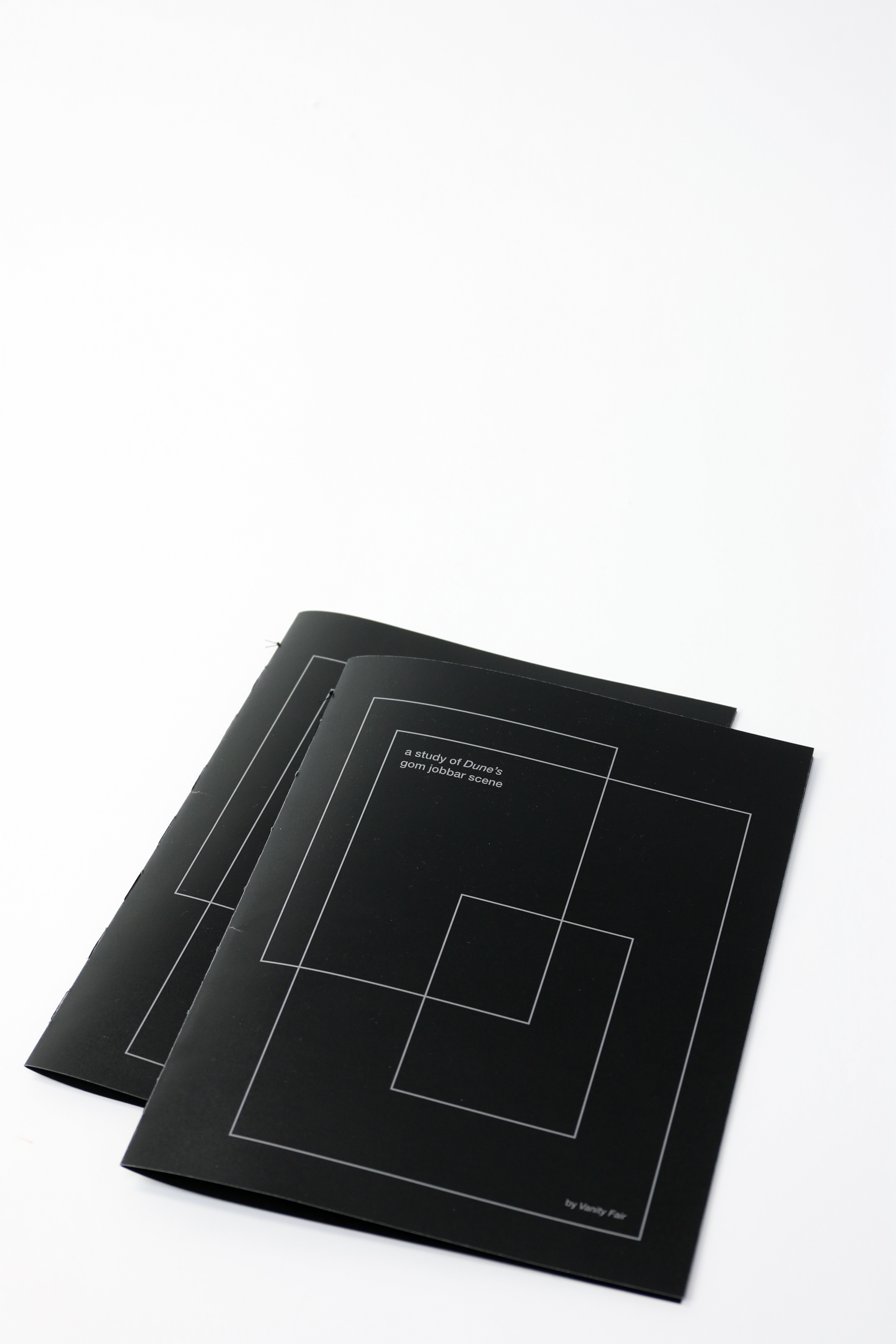 'A Study of Dune’s Gom Jobbar Scene' is a synthesis of three different perspectives of the well-known gom jobbar scene from Dune . With the hope of gaining insight on this titular moment, the booklet presents a way to see its evolution from page to screen. Delve into a world run by people whose desire for power and spice consumes them and get an up close look at a moment that sets young Paul Atreides on the path to gaining a position of influence in it.