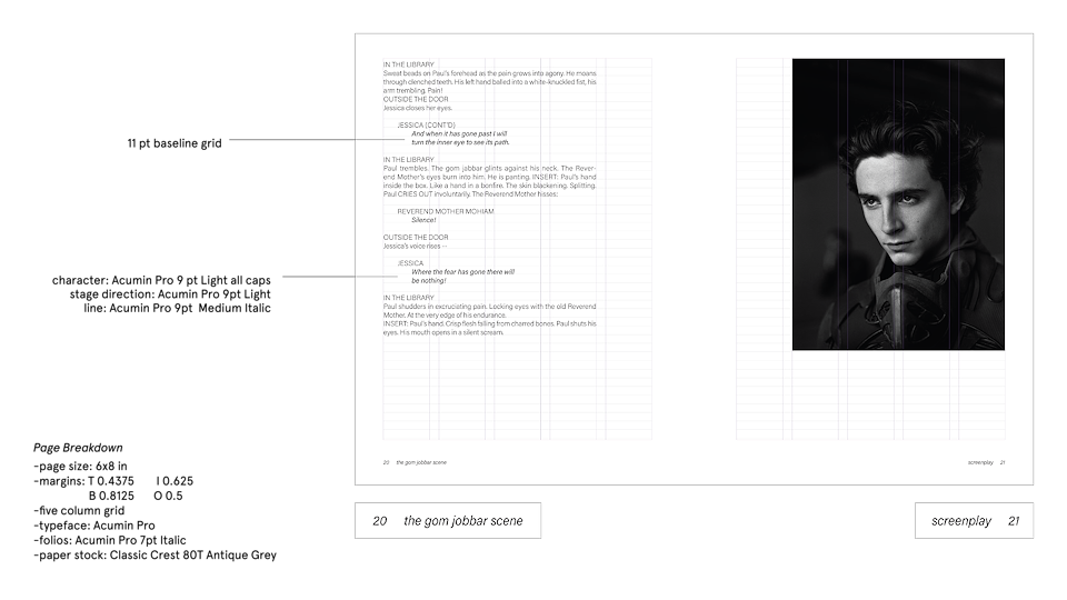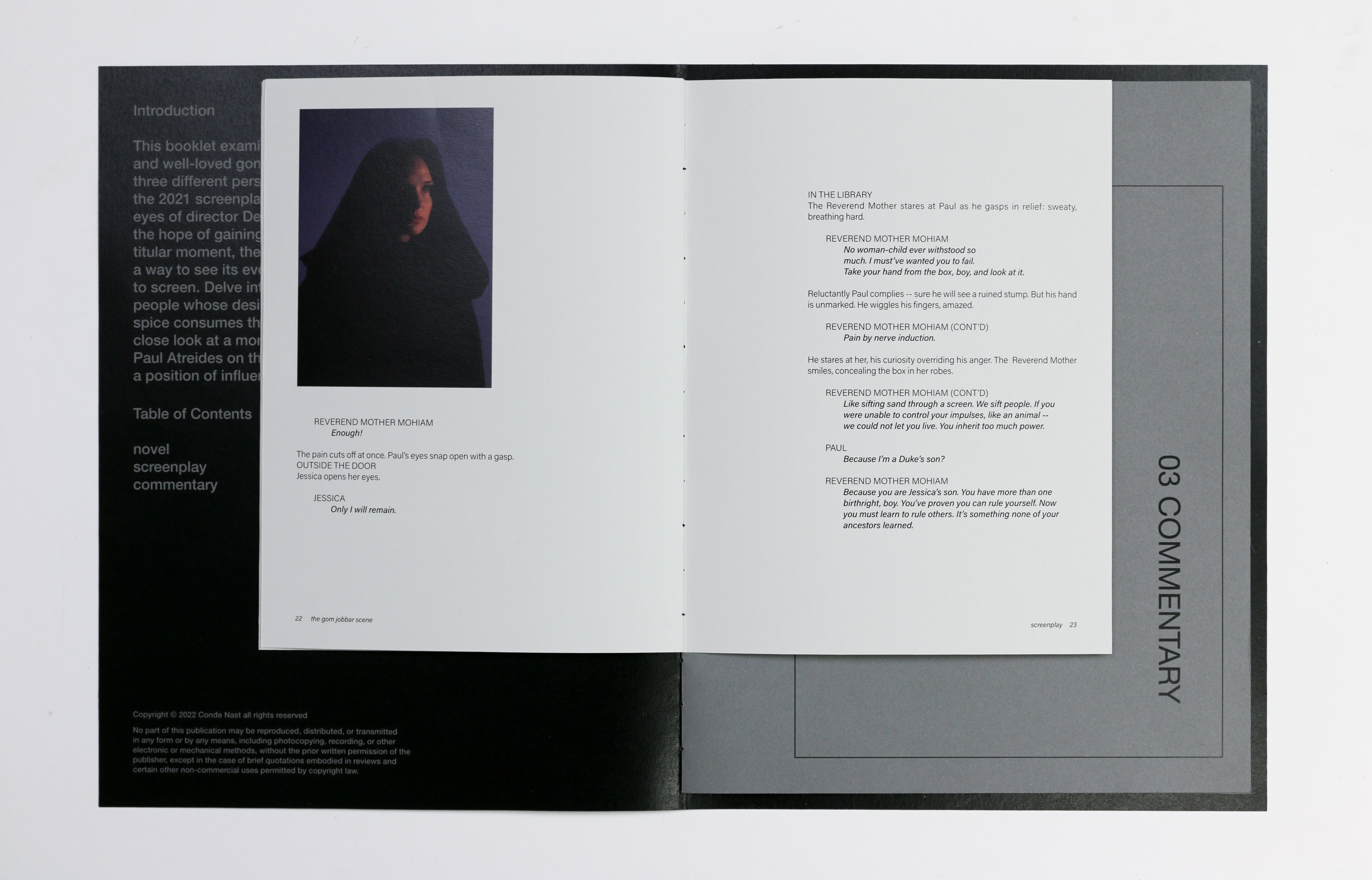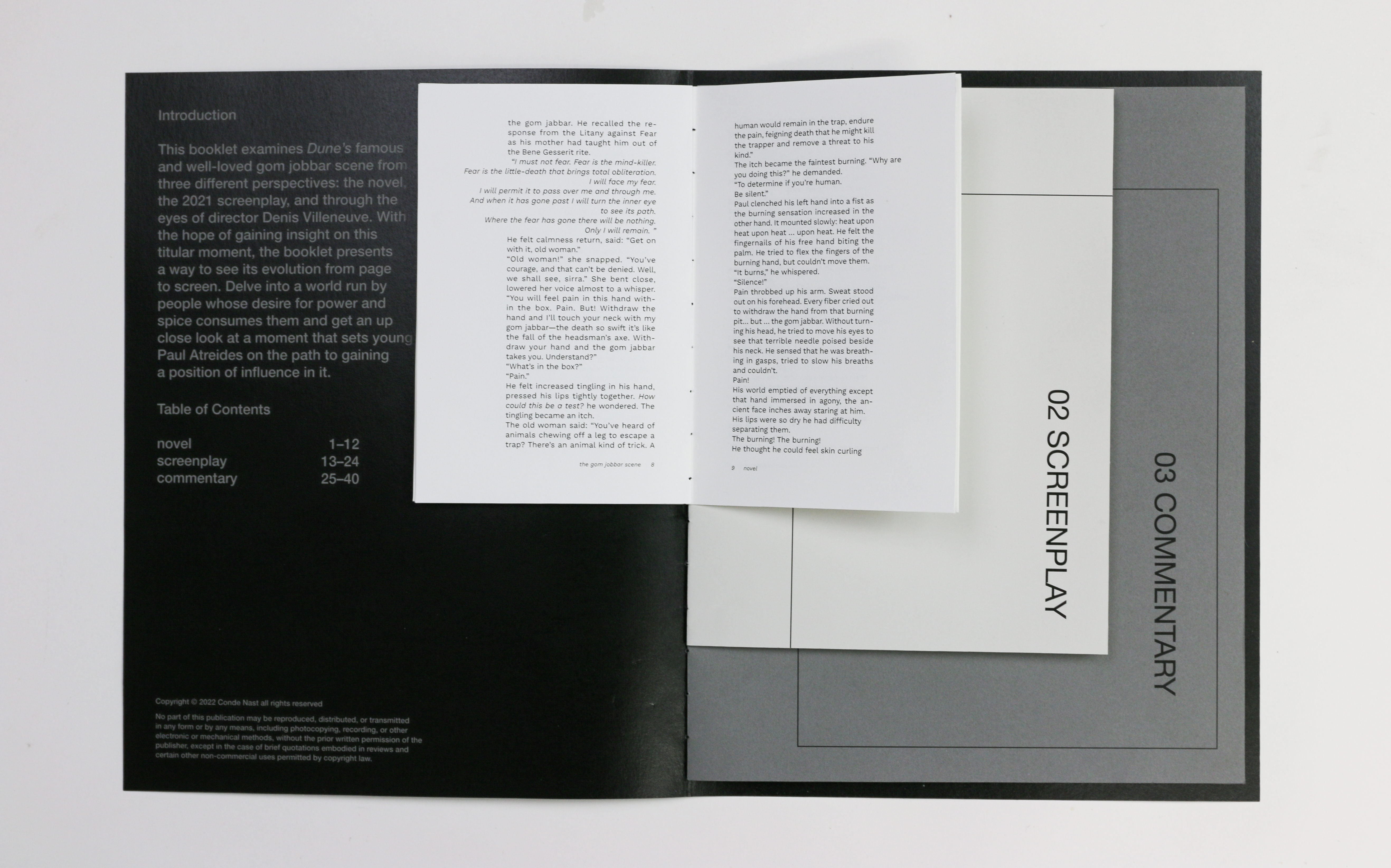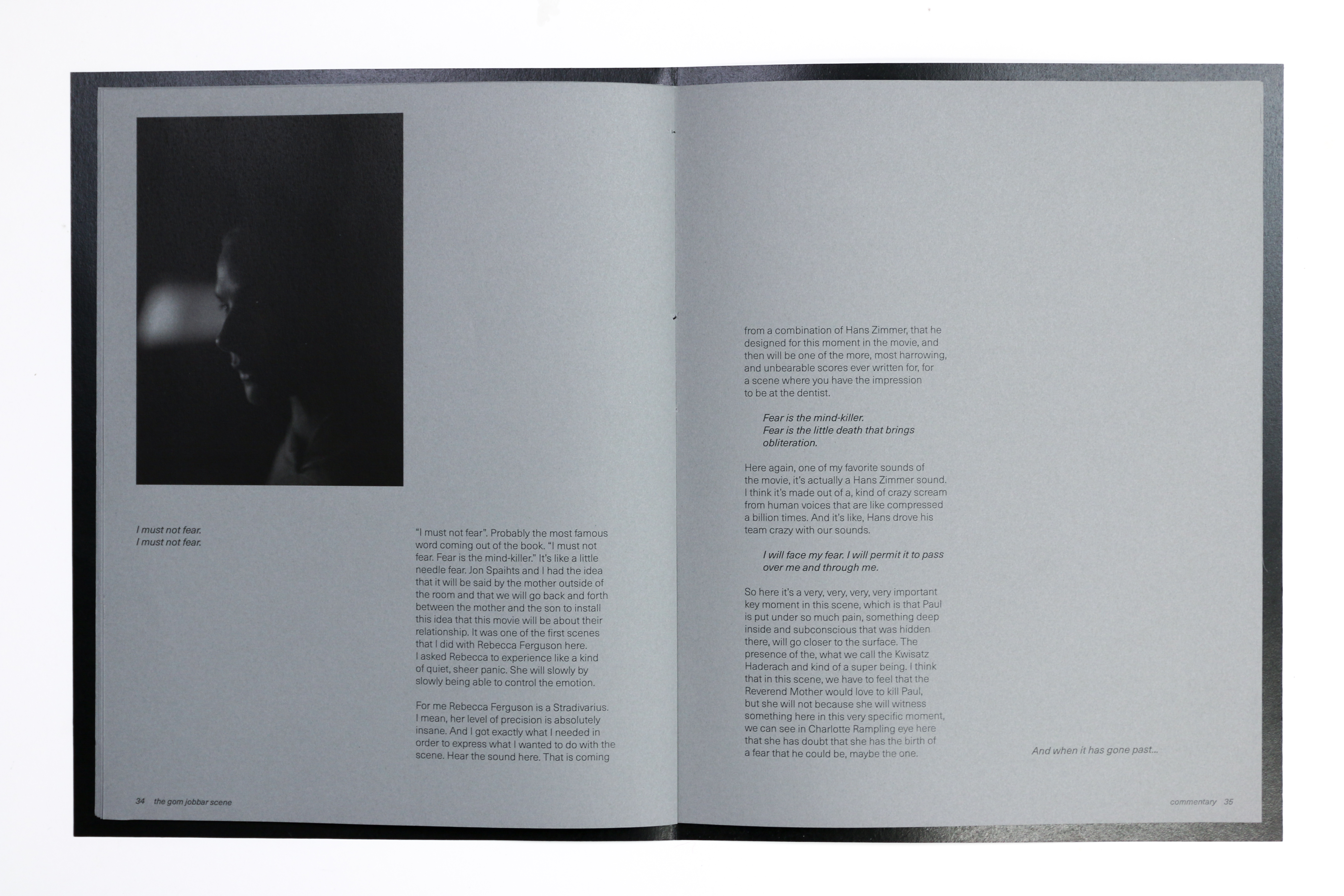 'A Study of Dune’s Gom Jobbar Scene' is a synthesis of three different perspectives of the well-known gom jobbar scene from Dune . With the hope of gaining insight on this titular moment, the booklet presents a way to see its evolution from page to screen. Delve into a world run by people whose desire for power and spice consumes them and get an up close look at a moment that sets young Paul Atreides on the path to gaining a position of influence in it.