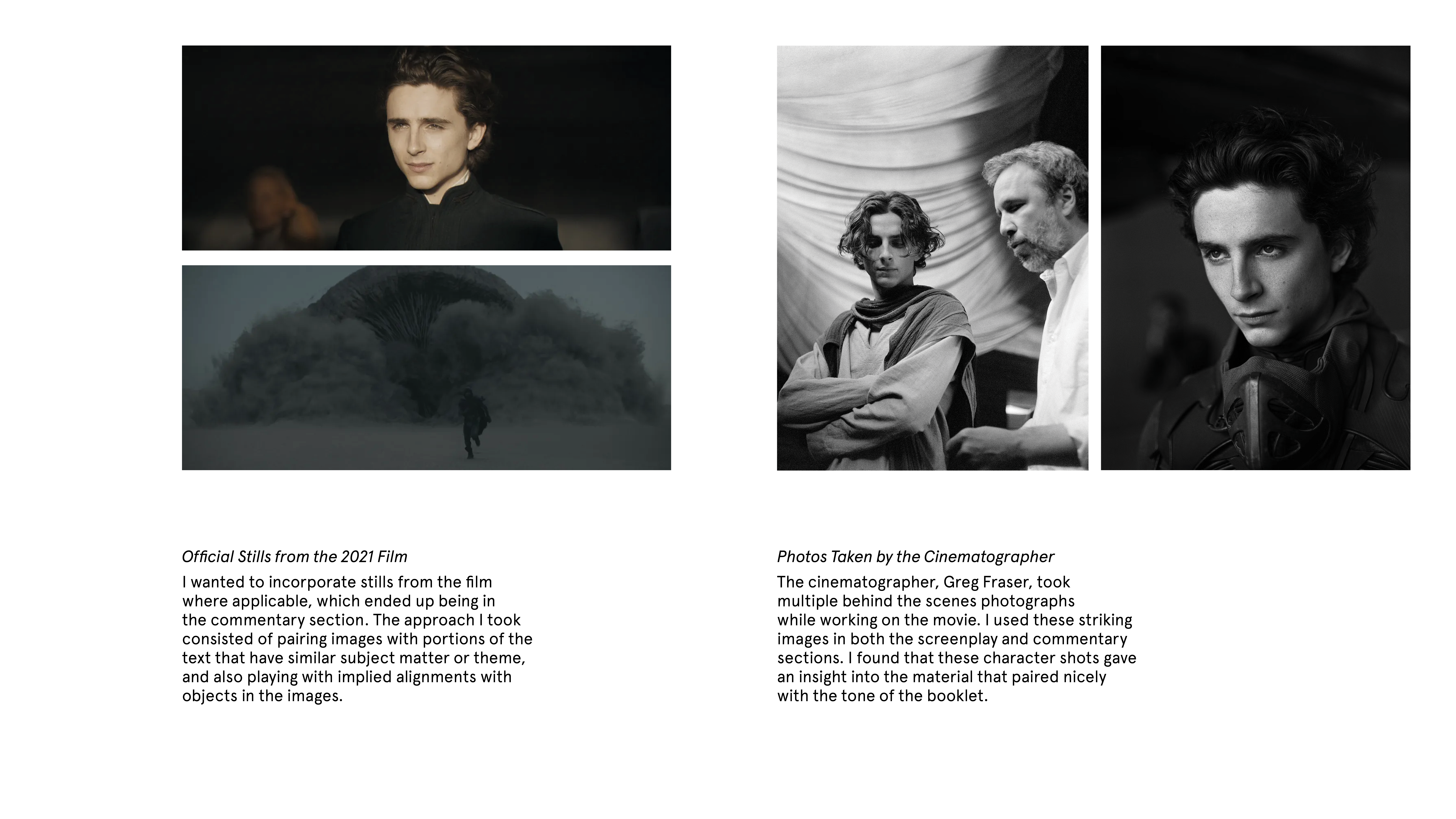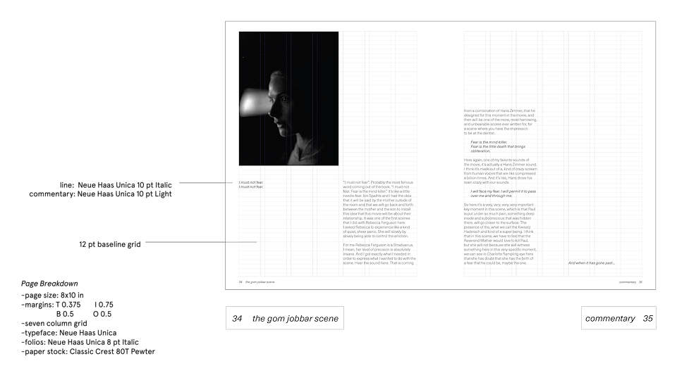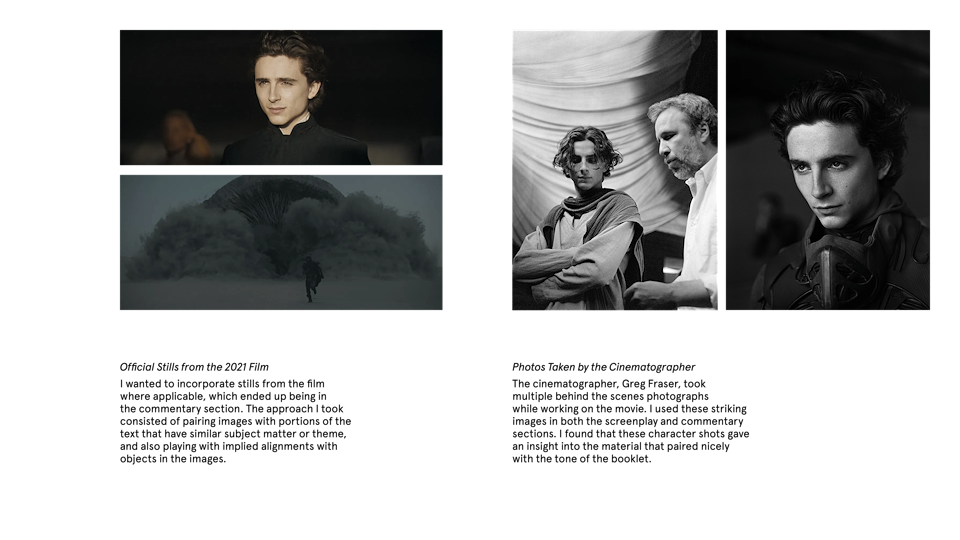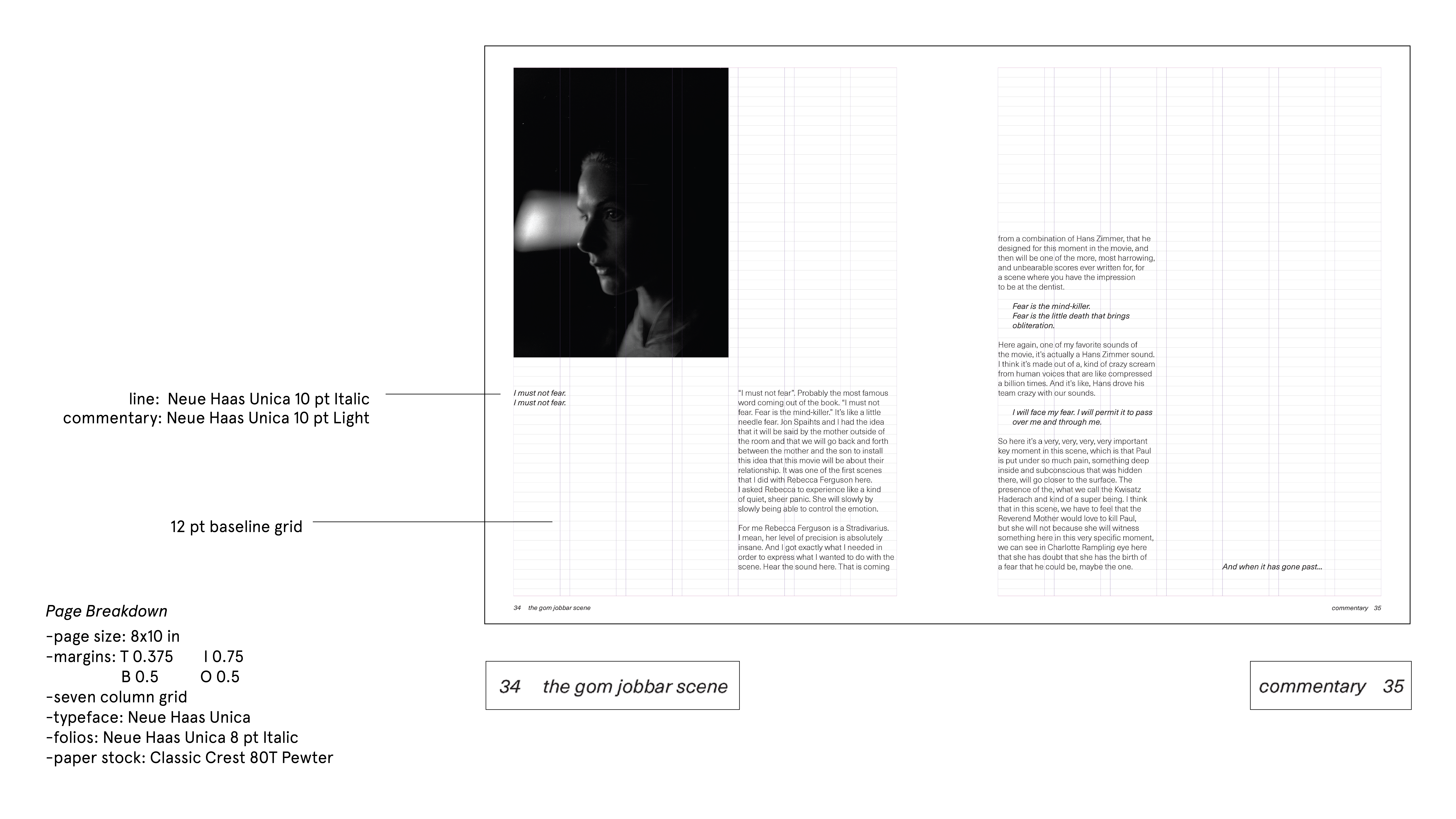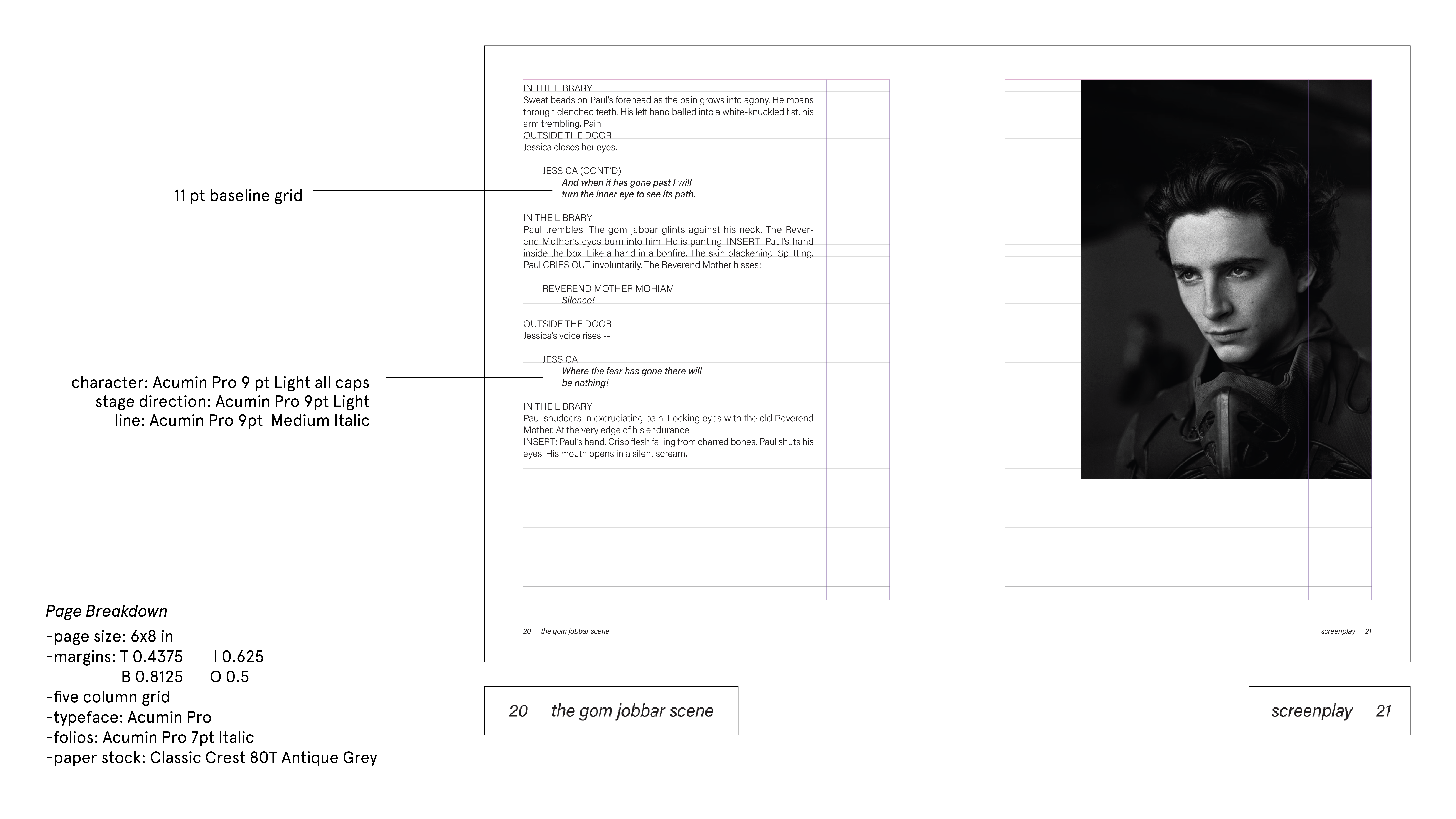 'A Study of Dune’s Gom Jobbar Scene' is a synthesis of three different perspectives of the well-known gom jobbar scene from Dune . With the hope of gaining insight on this titular moment, the booklet presents a way to see its evolution from page to screen. Delve into a world run by people whose desire for power and spice consumes them and get an up close look at a moment that sets young Paul Atreides on the path to gaining a position of influence in it.