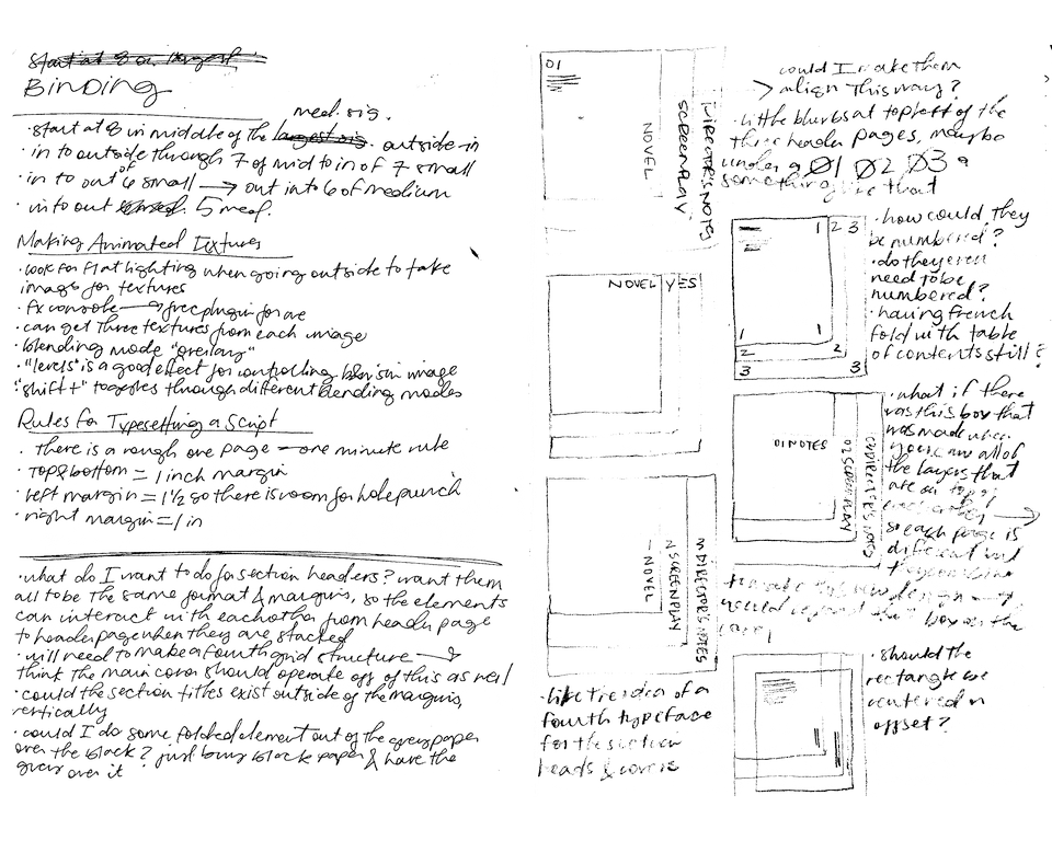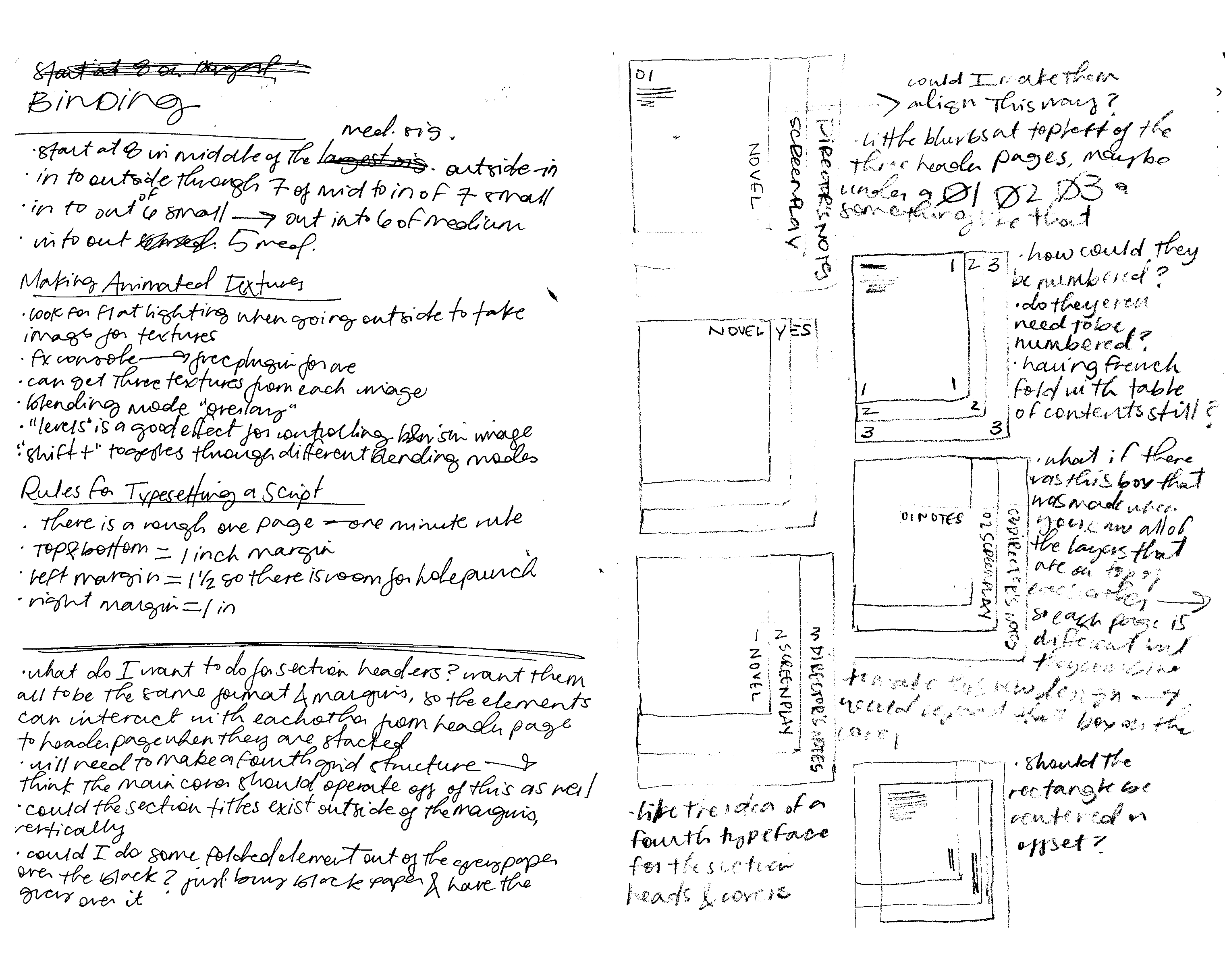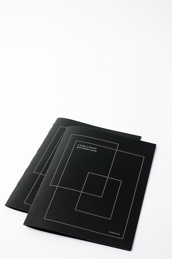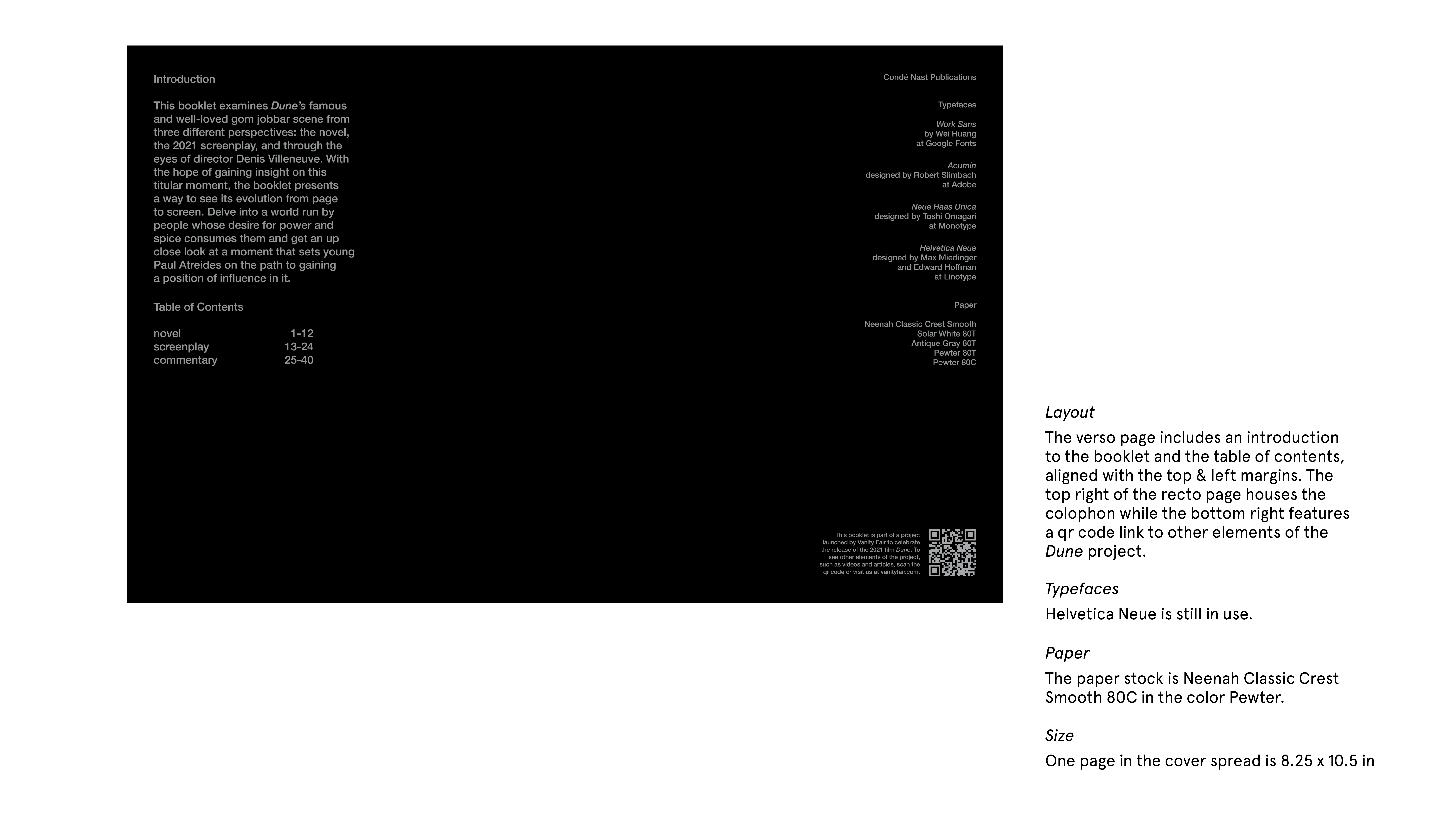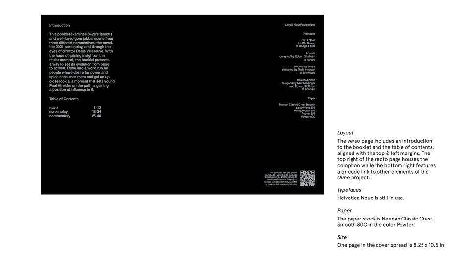 Each section of the booklet has its own paper size, paper colour, grid structure, and typeface. These elements serve to visually differentiate the three copy sources from each other. Nesting the sections on top of each other from smallest to largest results in the reader being greeted by all three sections of the publication at once. This format creates a 'choose your own adventure' opportunity for the reader. Rather than keeping the traditional linear experience of reading a book, the audience is presented with the choice of starting at the beginning or jumping to one of the later sections.