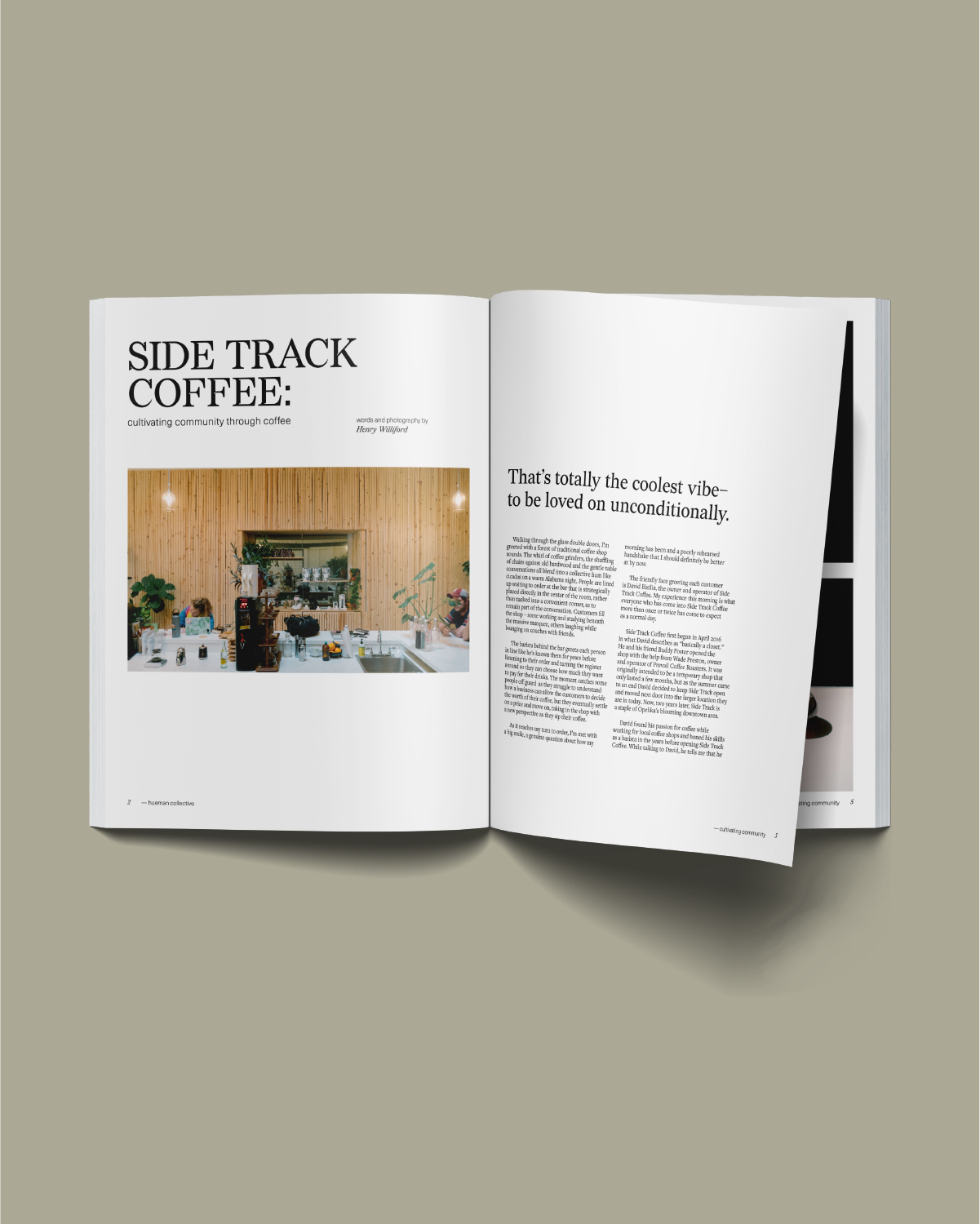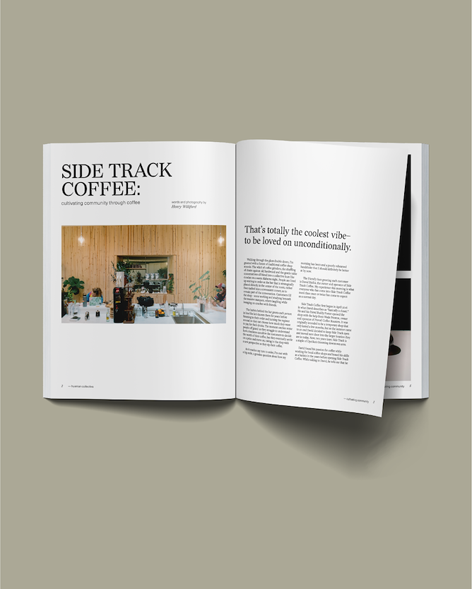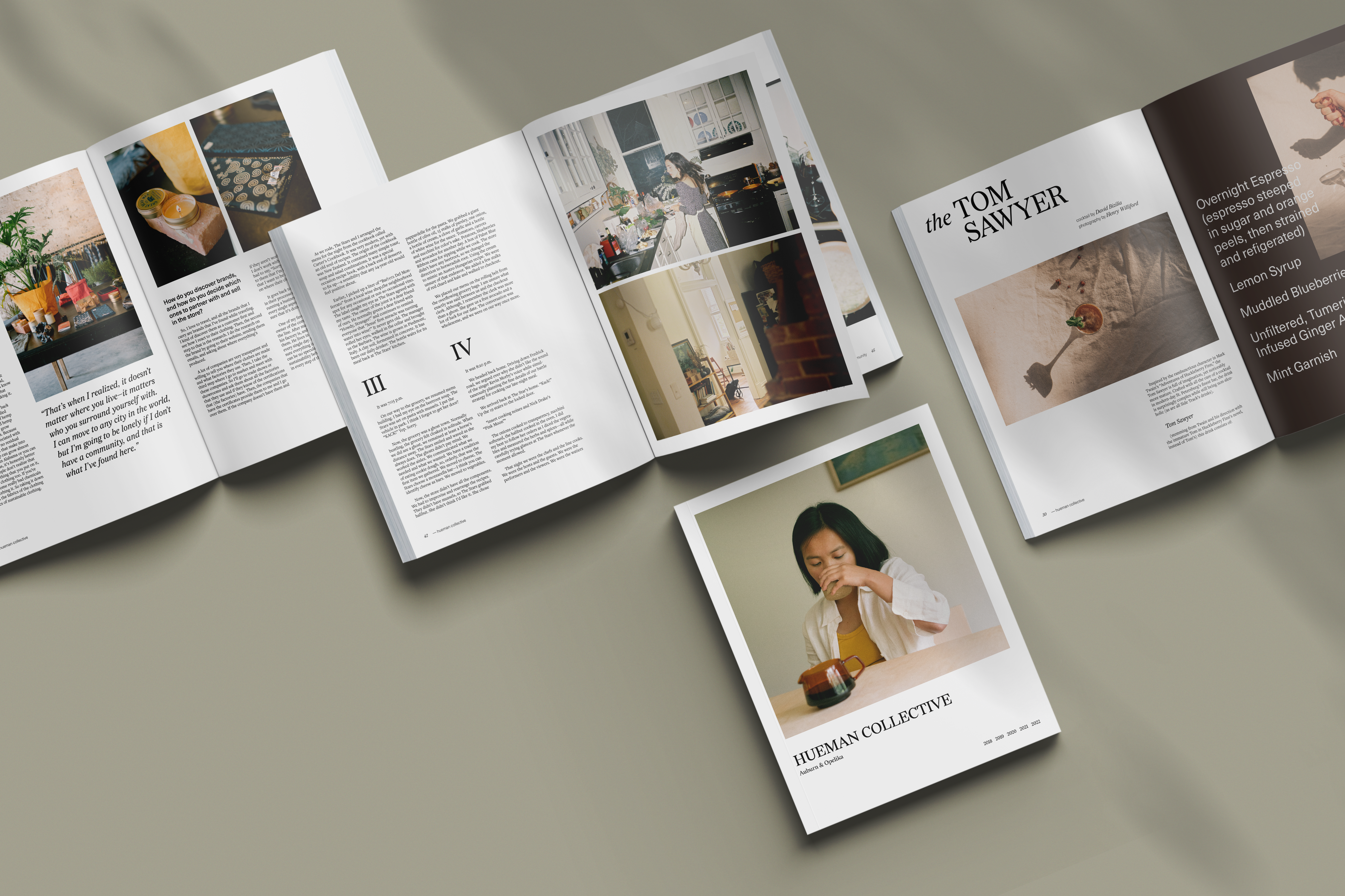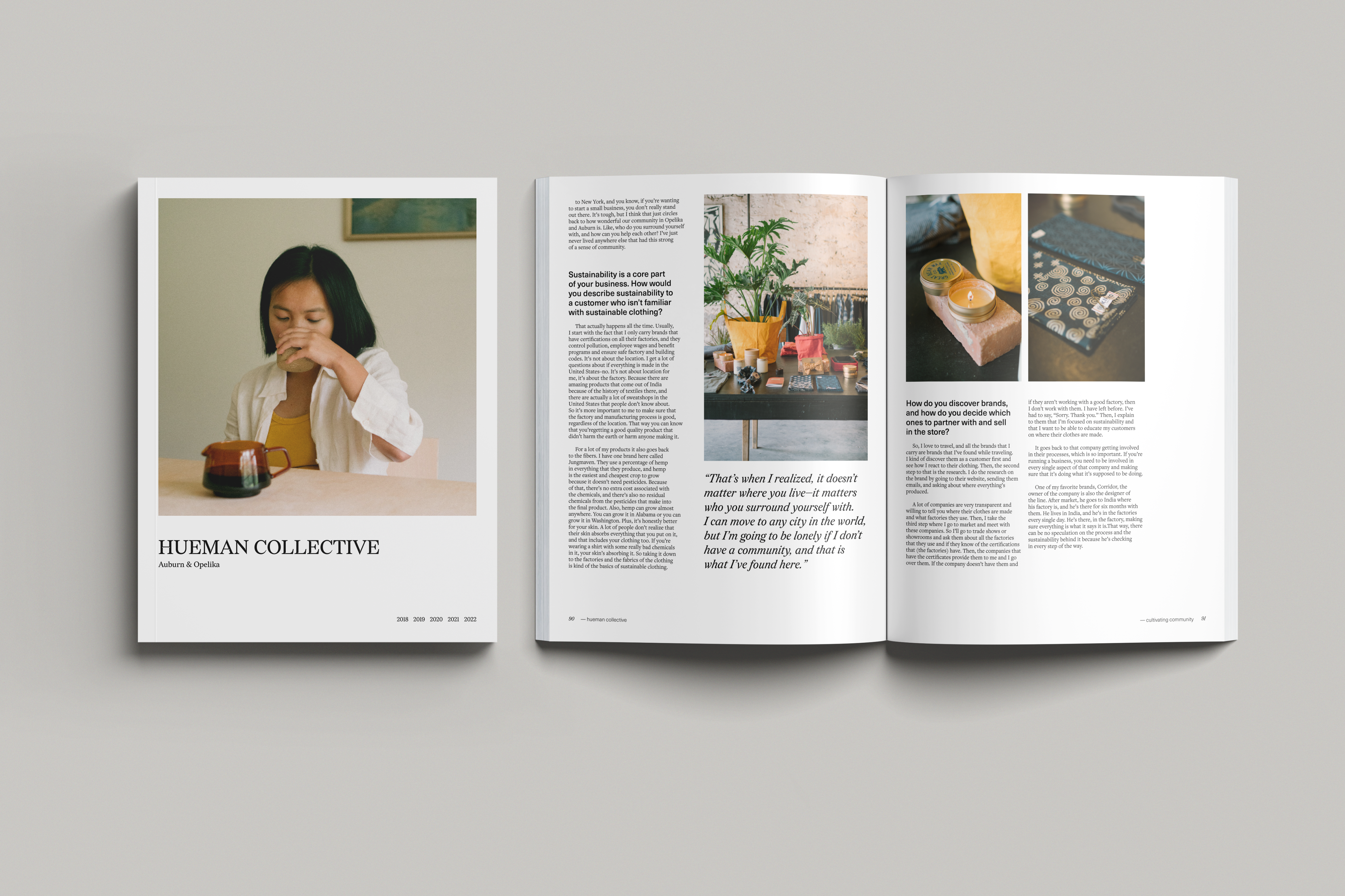 Hueman Collective is dedicated to telling stories that strengthen the sense of community in the Auburn/Opelika area. Acting as a culmination of this venture, the print edition is a tangible representation of the stories that tie us all together. The spreads themselves were designed with a clean elegance in mind, allowing the beautiful imagery to shine and the different types of stories to have a similar visual tone.