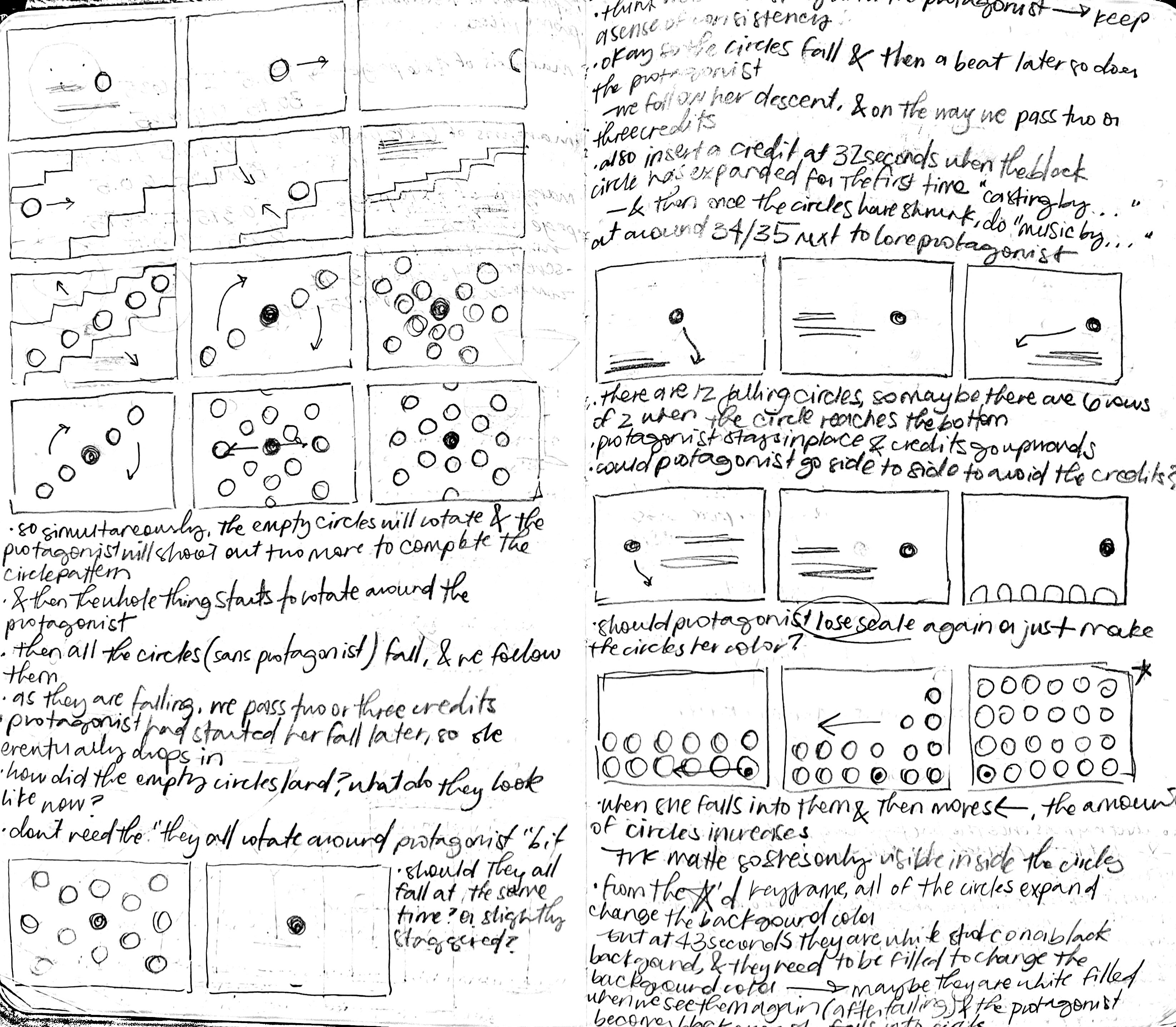 The opening title sequence gives the audience an abstracted synopsis of the film, illustrating the steps of the creative process. Following the 'protagonist', an audience witnesses the onslaught of ideas, the trial and error stage, and the synthesis of a final product. Working with simple geometric shapes, predominately circles, the animation serves as a microcosm of the feature length film to follow.