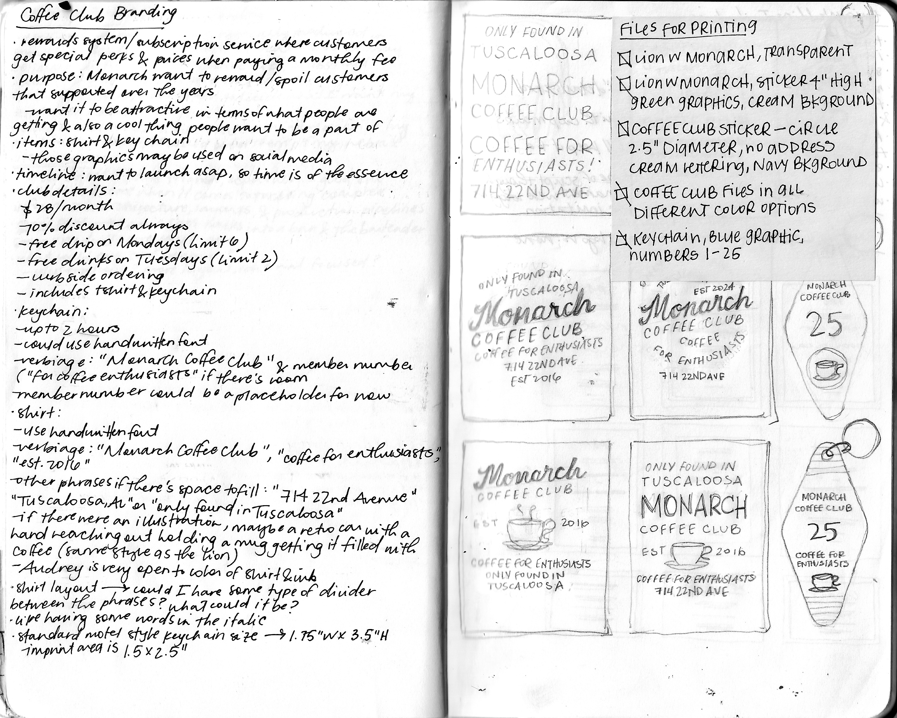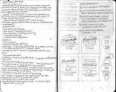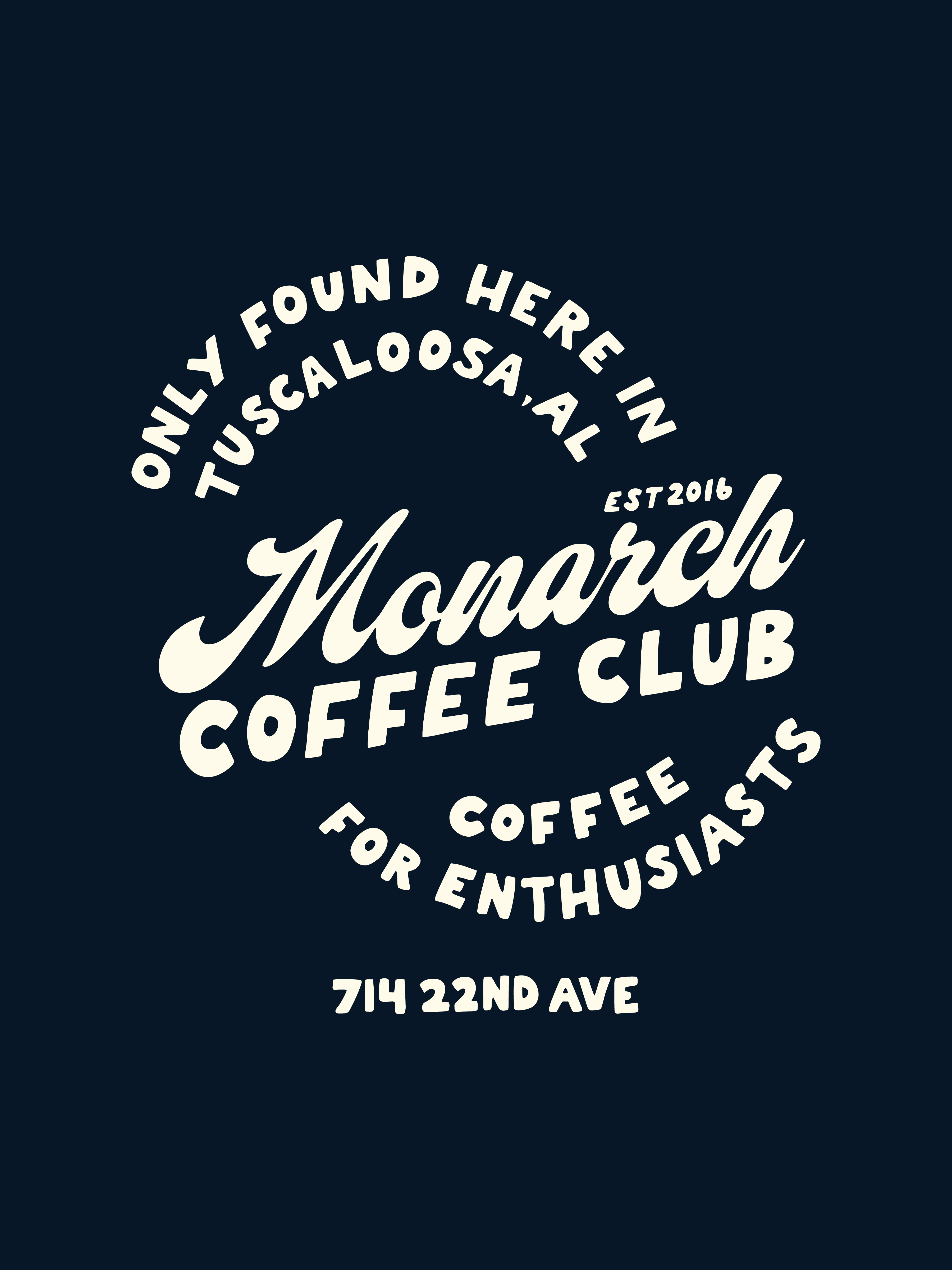 Monarch Coffee Club is a subscription service offered by the cafe. I was asked to design a shirt (above right illustration) as well as keychains, hats, stickers, etc. The hand-lettering keeps with the shirt series I created while the overall design lends itself to being applied to different pieces of merchandise.