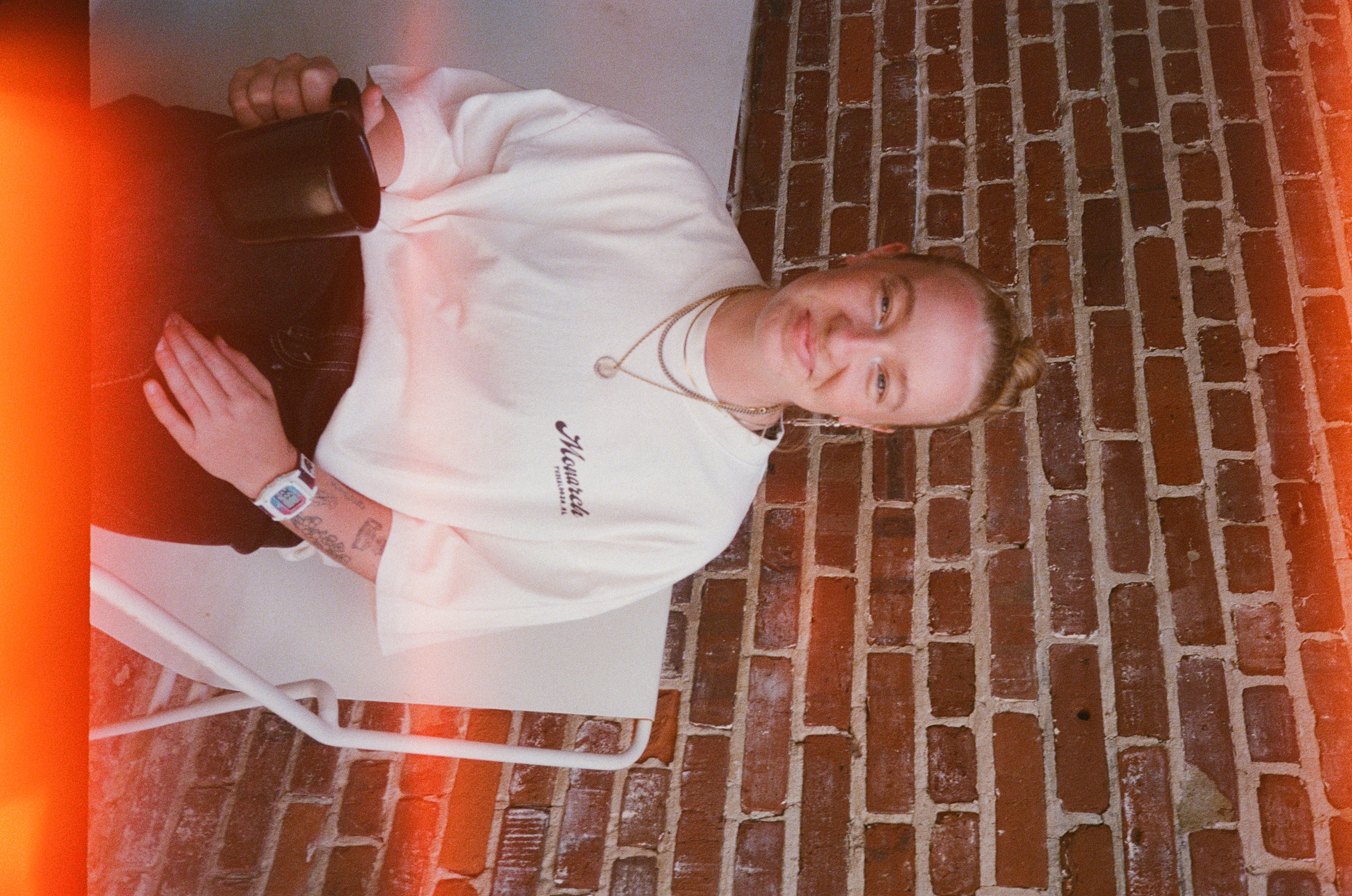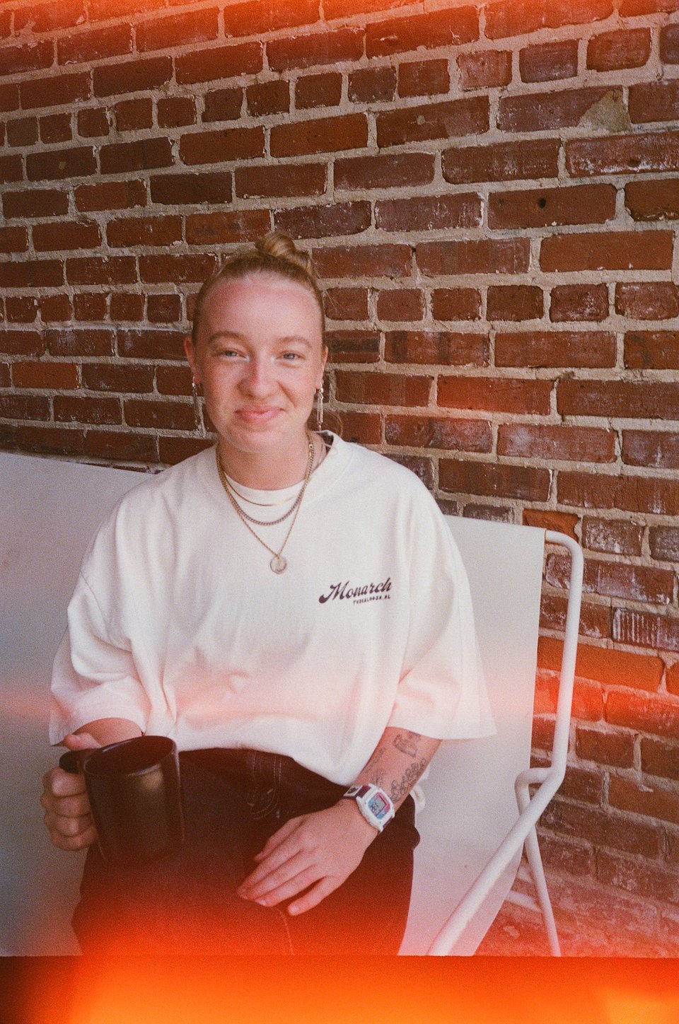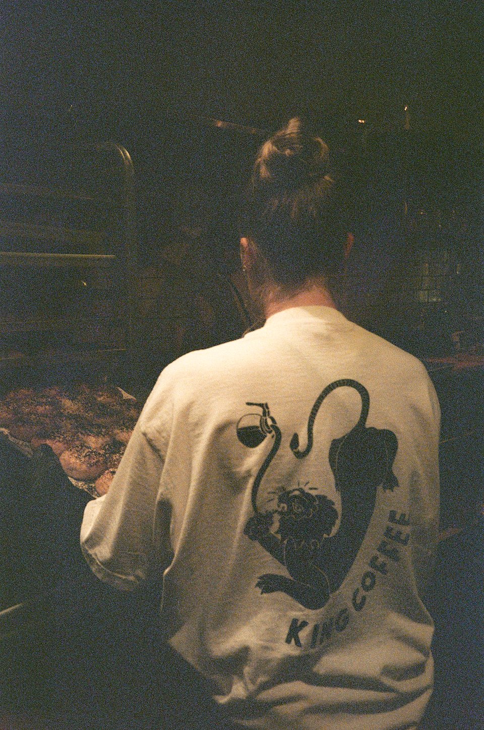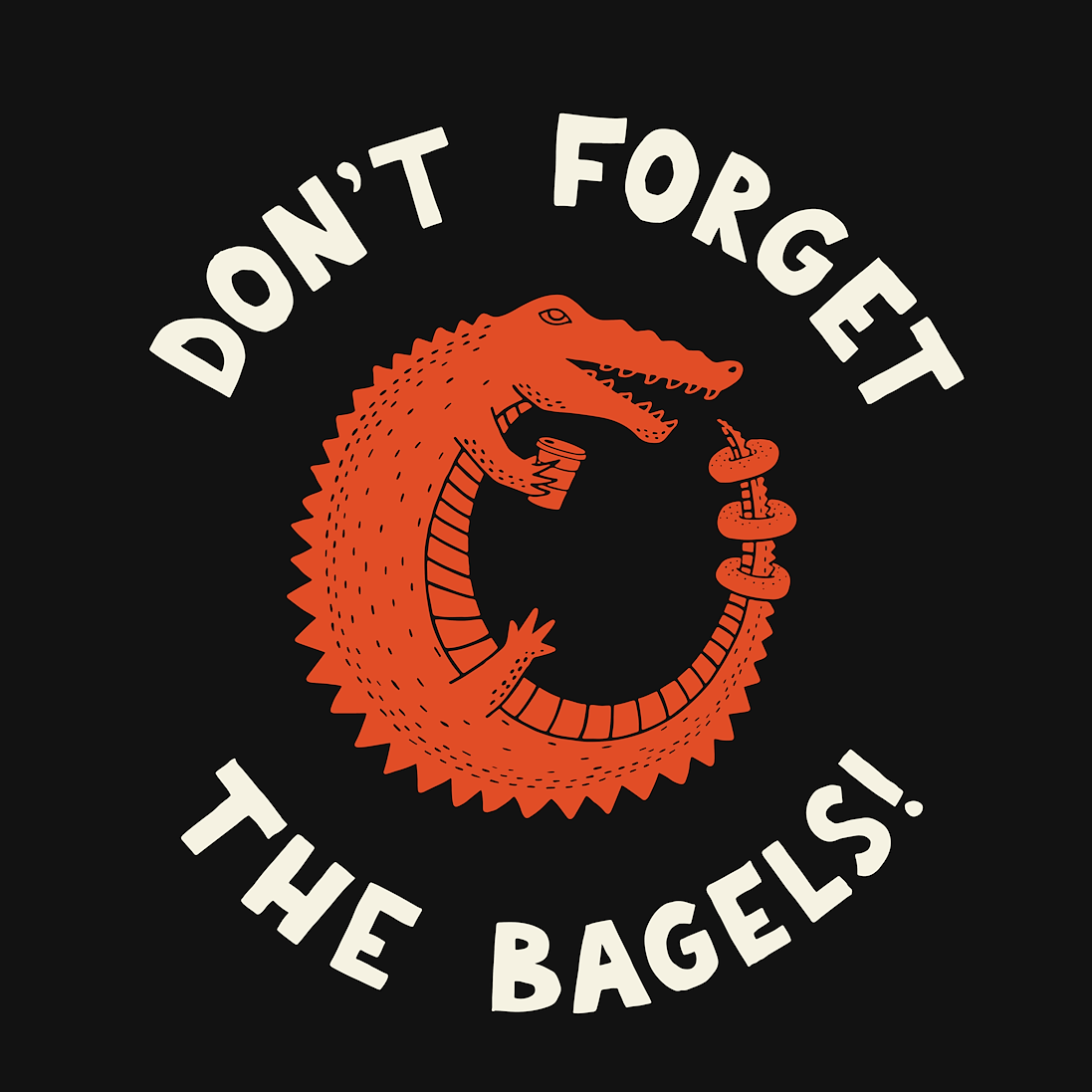 The second instalment in this animal series is an alligator eating bagels. Monarch hand-makes all of their bagels, and the owners wanted to highlight that idea in a fun, unserious way. The drawing style and lettering are in keeping with that of the first shirt, while the new colours give it a life all its own.